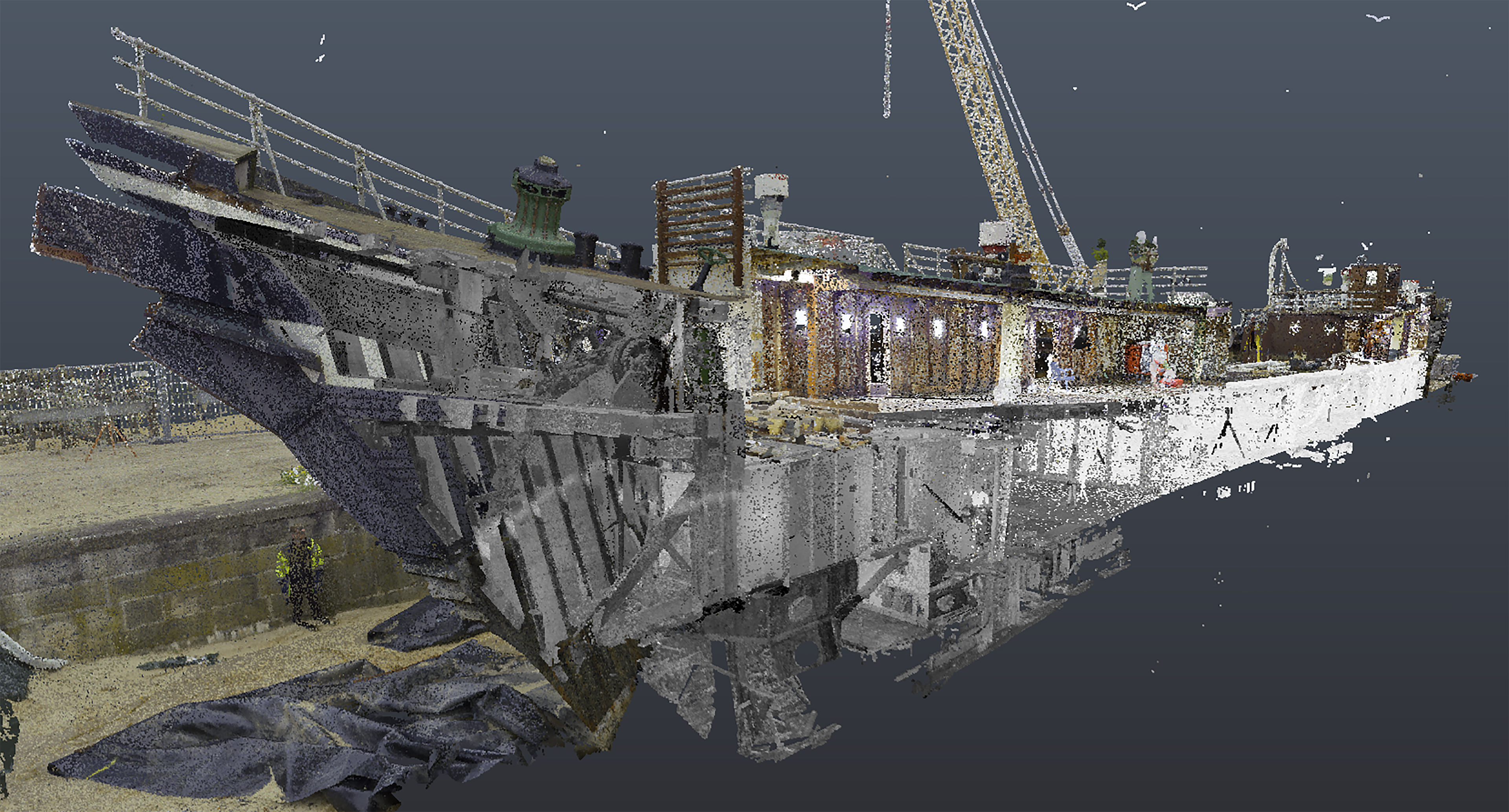 Einen kompletten Tag waren Volker Platen und sein Team von der Firma denkmal3D damit beschäftigt, mit modernster Technik Scans der SEUTE DEERN zu erstellen. Rund um das Schiff und an Bord vermaßen die Ingenieure Zentimeter für Zentimeter. Vier Milliarden Messpunkte und 250 Scans kamen zusammen. Sie wurden im Anschluss zwei Tage am Computer zu einer sogenannten Punktwolke zusammengesetzt, die ein genaues Bild des Ist-Zustandes des Seglers zeigt. Mit dem so entstandenen Positionierungsplan kann das Deutsche Schifffahrtsmuseum (DSM) / Leibniz-Institut für Maritime Geschichte nach dem Rückbau arbeiten.