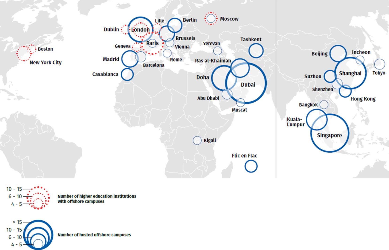 The most important destination countries for offshore campuses are China (67), the United Arab Emirates (44), Singapore (19), Malaysia and Spain (17 each). However, branches are not only exported from the global North to the global South. European countries and cities are prominently represented both as importers and exporters of campuses, especially London and Paris. Overall, offshore campuses are strongly concentrated in a few large cities, especially Dubai (29), Singapore (19), Shanghai (15), London and Doha (both 12). In several cases, one city accounts for a significant proportion of all Offshore Campuses (Dubai accounts for 66% of all locations in the United Arab Emirates and London for 80% of all locations in the UK).