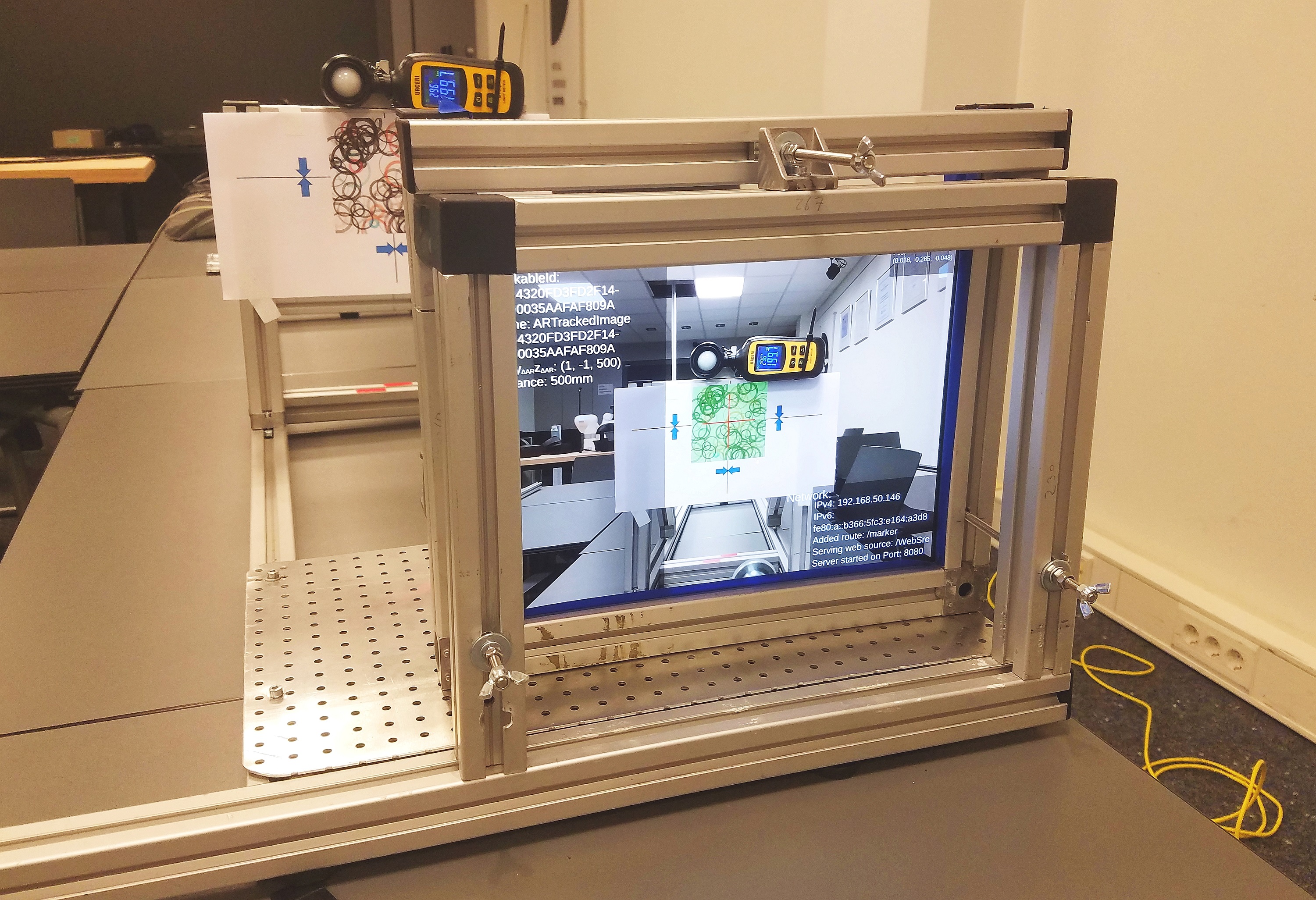 Zielsetzung der hier behandelten VDC-Arbeiten war es, eine standardisierte Messmethode zur Evaluierung und Bewertung gängiger AR-Trackingverfahren - unter Einwirkung physikalischer Einflussgrößen - zu entwickeln und anhand verschiedener AR-Bibliotheken zu evaluieren. Dafür wurde ein Mess-Aufbau konzipiert und realisiert (Gestell aus Standard-Montageprofilen), der es ermöglicht, Tablet PC und Tracking Target (Marker) physisch in eine definierte Position zueinander zu bringen, die unabhängig vom AR-Trackingsystem bestimmt werden kann. Eine Applikation wurde programmiert, die die Kalibrierung und Messwert-Aufnahme unterstützt: sie zeigt ein Live-Videobild mit Fadenkreuz, mit des-sen Hilfe der Tablet PC über drei Flügelschrauben physisch auf das Tracking Target ausgerichtet werden kann. Als Entfernungsmesser kommt ein Distometer, als Beleuchtungsmesser ein Luxmeter zum Einsatz. Für die dynamische Messung wird der Tablet PC durch einen Roboter bewegt. Die Applikation existiert aktuell in drei Versionen, einmal für die AR-Bibliothek ARCore (Android-Gerät), für Vuforia (Android-Gerät) und ARKit (iOS-Gerät). Weiterhin etabliert die Applikation einen Webserver, mit dessen Hilfe über einen weiteren Rechner die Messdaten vom Tablet PC abgerufen werden können, da dessen Messungen nicht über manuelle Bedienung am Tablet PC gestört werden sollen.