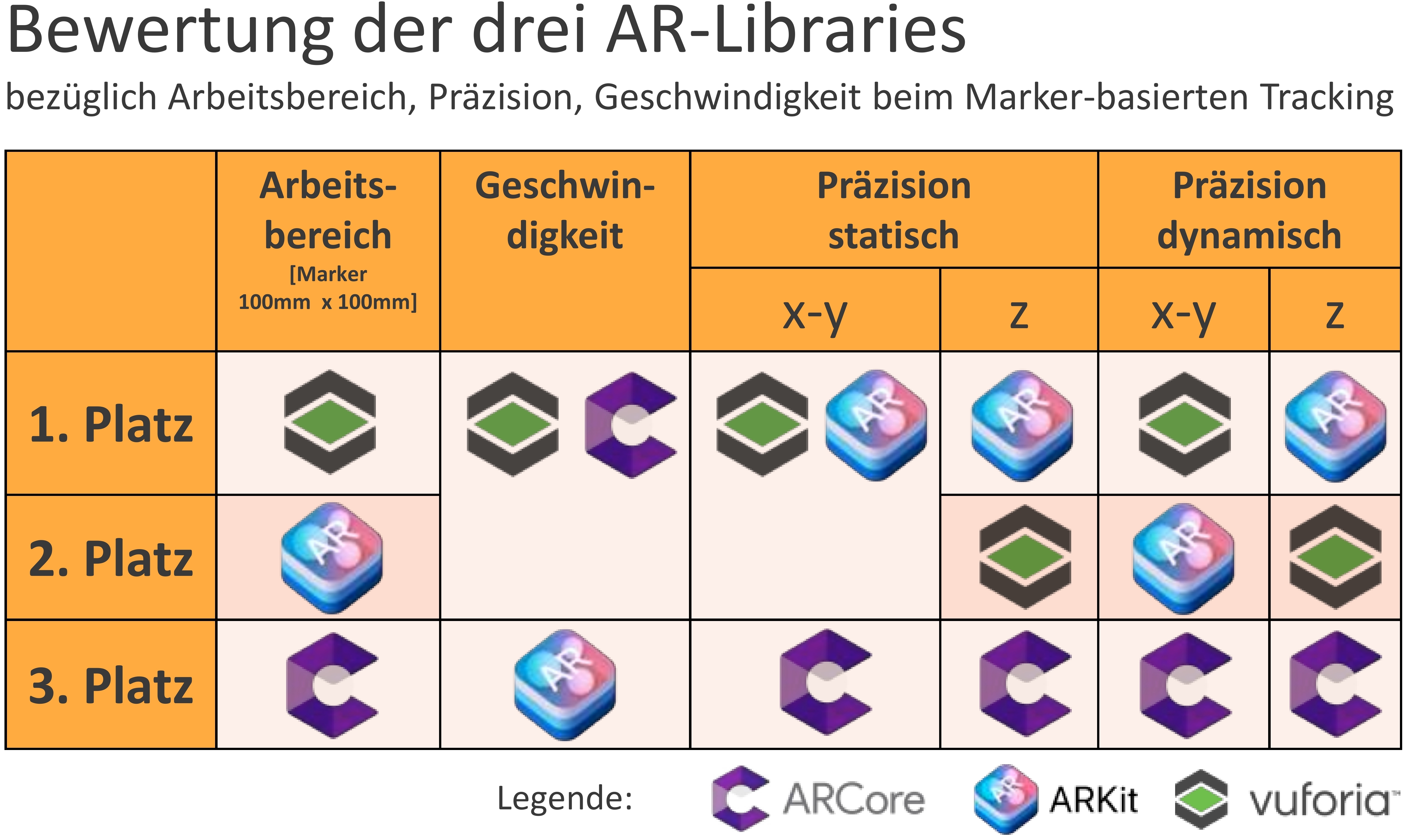 Arbeitsbereich: die mögliche Arbeitsdistanz - respektive die notwendige Markergröße - der drei AR-Bibliotheken ist deutlich unterschiedlich. Vuforia liegt hier klar vor ARKit, ARKit wiederum deutlich vor ARCore.