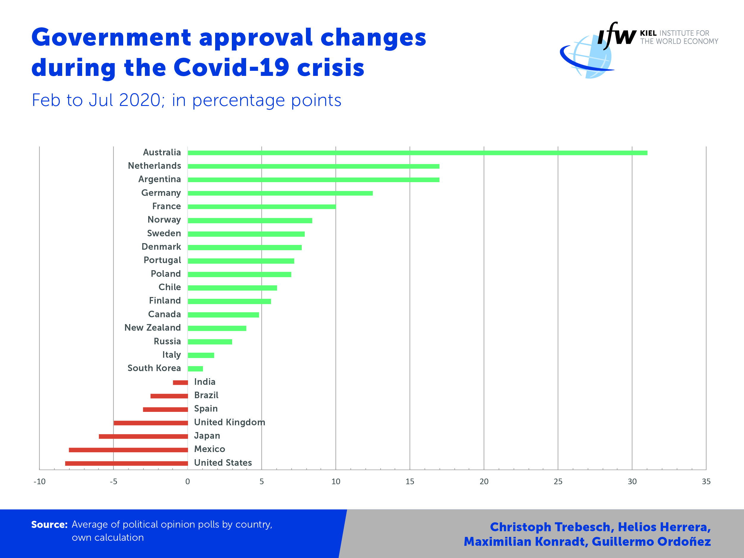 For the study, researchers compiled a novel database of government approval ratings and election intentions in 35 countries on a weekly basis. They are evaluating this new data resource along with information on Covid-19 infection rates and deaths, as well as indicators of economic activity and political containment measures. The countries under review include 20 developed and 15 emerging economies, where political opinion surveys are conducted very regularly. Overall, these countries account for 65 percent of global economic output. The authors are Helios Herrera from British Warwick University, Maximilian Konradt from Graduate Institute Geneva, Guillermo L. Ordoñez from University of Pennsylvania, and Christoph Trebesch from the Kiel Institute for the World Economy.