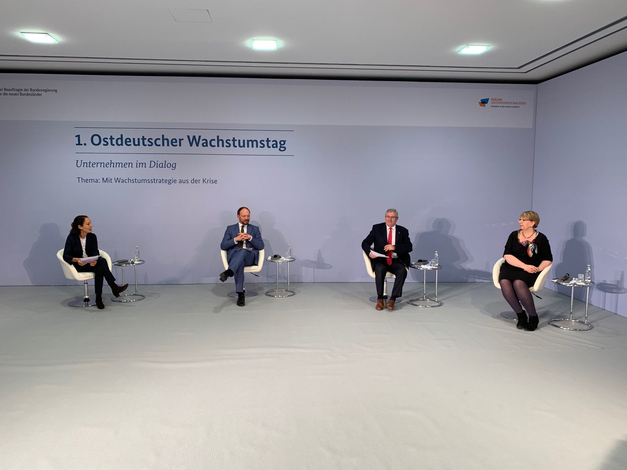 Der 1. Ostdeutsche Wachstumstag ist die zentrale Veranstaltung des Dialogs „Unternehmen wachsen“. Im Rahmen des Dialogs teilen Unternehmen aus den neuen Bundesländern, die für sich bereits erfolgreich eine Wachstumsstrategie umgesetzt haben, ihre Erfahrungen mit Unternehmerinnen und Unternehmern, denen dieser Schritt noch bevorsteht. Kern des Dialogs sind regionale Unternehmertreffen. In der aktuellen Krisensituation wurden die Treffen im hybriden Format durchgeführt.