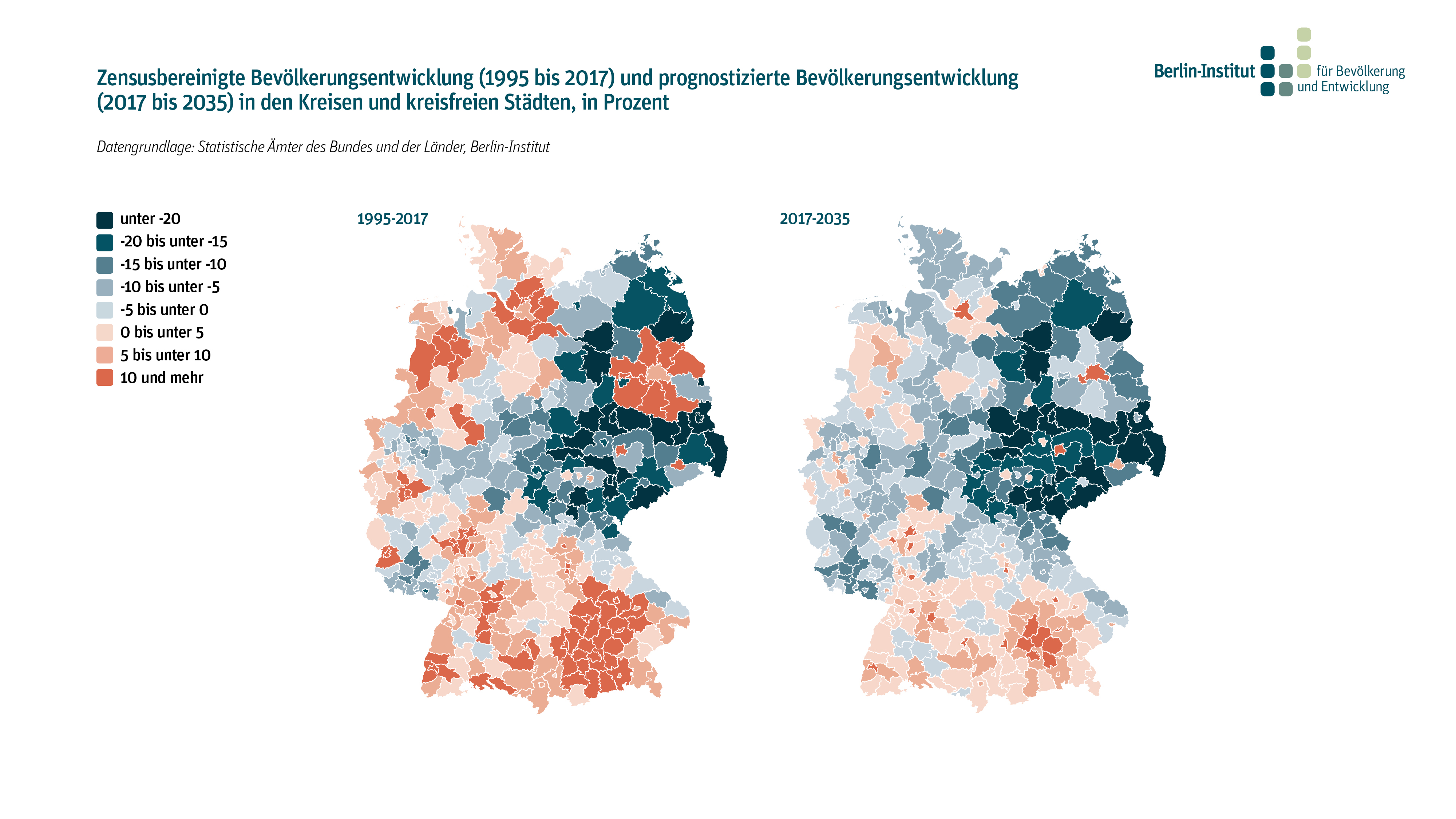 Erstmalig hat das Berlin-Institut ergänzend zu seiner Studie ein interaktives Karten- und Grafiktool erstellt. Dieses erlaubt es, die Entwicklungen seit der Wiedervereinigung nach regionalen, zeitlichen und thematischen Interessen noch detaillierter nachzuvollziehen. Zu den Karten und Grafiken gelangen Sie über folgenden Link: