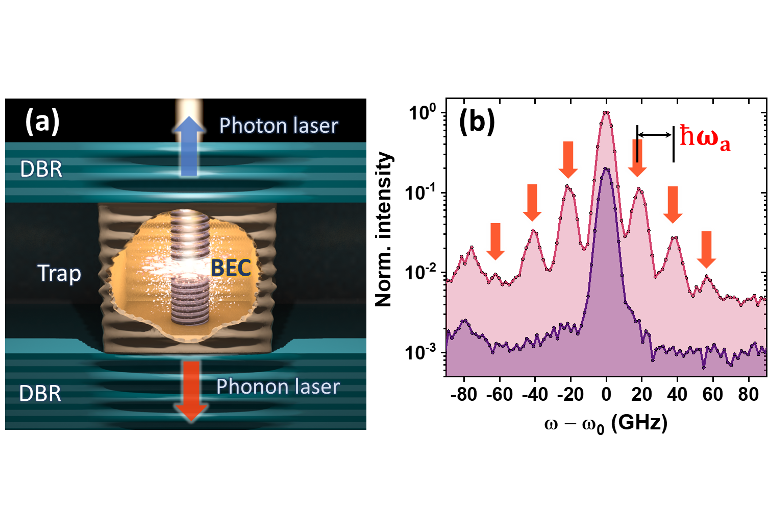 Figure 1. (a) Polariton BEC and phonon lasing of a microstructured trap in a semiconductor microcavity. (b) BEC emission under low (the lower curve) and high (the upper curve) particle densities, displaying phonon sidebands separated by the phonon energy ℏω_a .