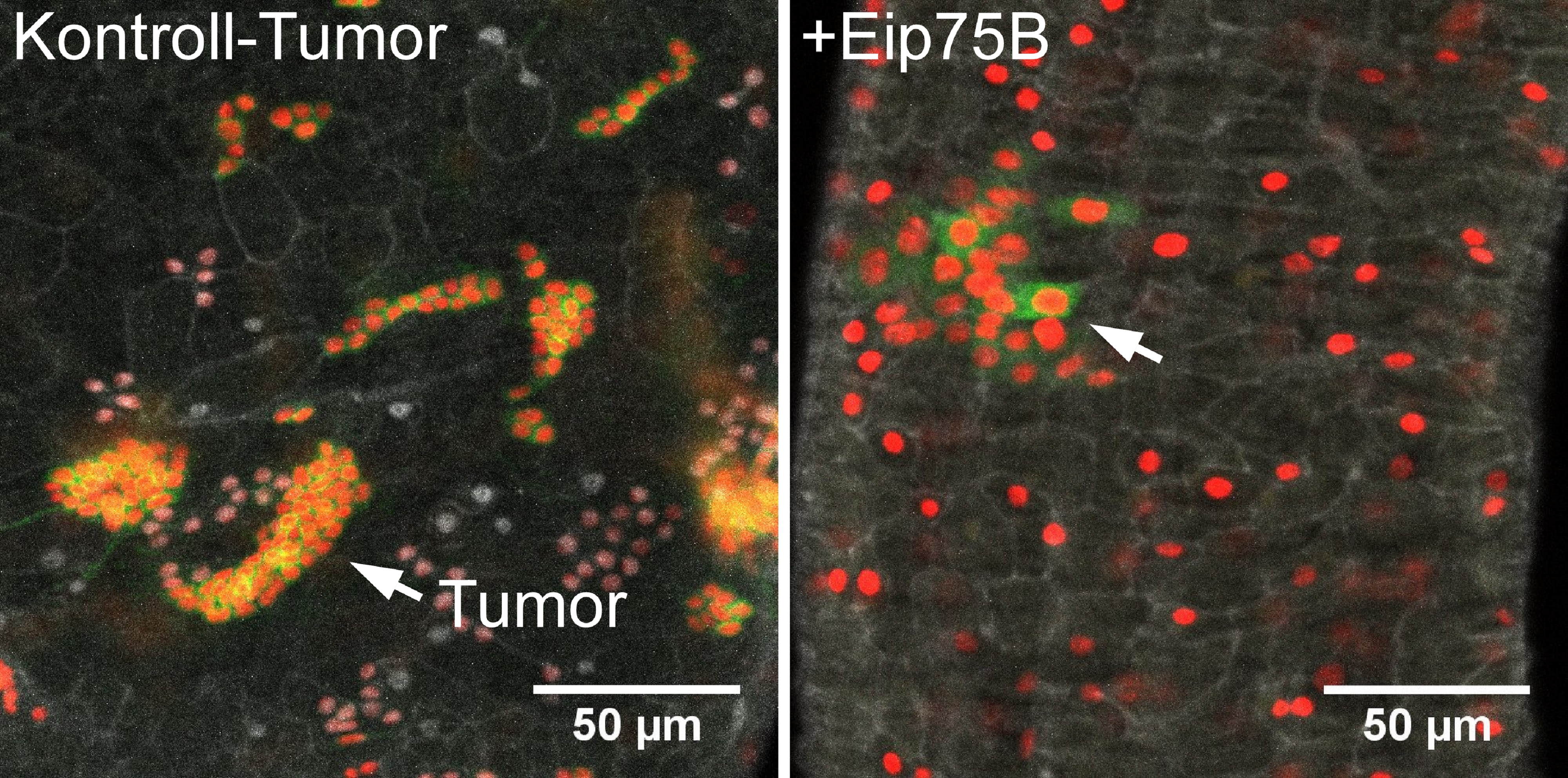 Tobias Reiff und seine Doktorandin Lisa Zipper konnten nun belegen, dass auch die Produktion von Steroidhormonen durch Verpaarung in weiblichen Fliegen erhöht wird. Der Fokus lag dabei auf dem hormonkontrollierten Zellwachstumsfaktor Eip75B. Nach der Verpaarung wird dieser Faktor vermehrt produziert, um das Darmepithel zu vergrößern. Auch in Fliegen mit Darmtumoren konnten die Stammzellen durch erhöhte Aktivität von Eip75B dazu gebracht werden, sich in Darmepithel zu entwickeln, wodurch es zugleich gelang, das Tumorwachstum zu unterdrücken (siehe Abbildung).