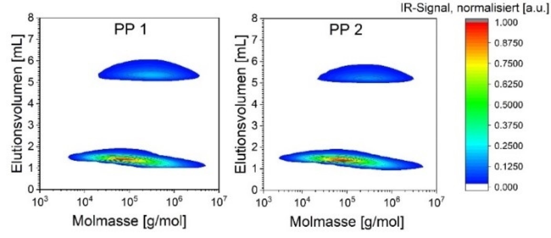 Um diesen Bedarf zu decken, wurde vom Fraunhofer LBF in Zusammenarbeit mit der Firma PolymerChar ein entsprechender Chromatograf entwickelt, der Betriebstemperaturen bis zu 200 °C ermöglicht. Dieser ist mit jeweils einem neu entwickelten Infrarot (IR)- und UV-Detektor ausgerüstet, was das gesamte Spektrum der Schwingungsspektroskopie abdeckt. Damit ergeben sich vollkommen neue Perspektiven für die Untersuchung von Polyolefinen, Olefincopolymeren und deren Compounds. Beispielsweise lassen sich so Propylen-basierte Reaktorblends mit bisher nicht erreichbarer Genauigkeit untersuchen und Chargenschwankungen aufzeigen.