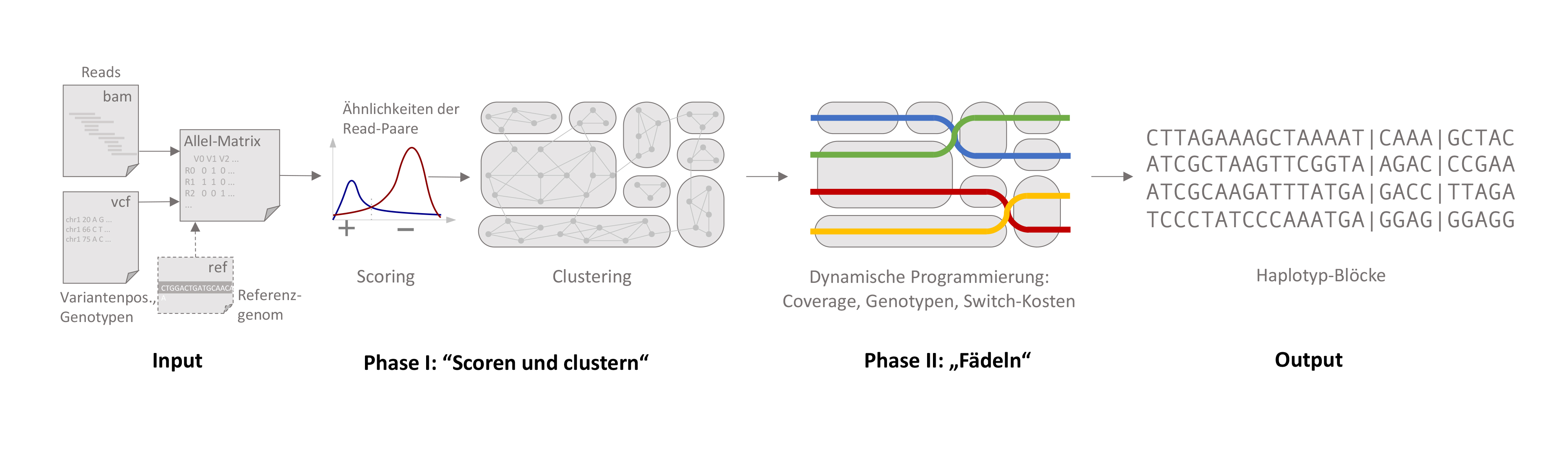 Das neue Tool löst das Problem in einem zweiphasigen Prozess. Zunächst werden die Reads geclustert, also in Gruppen aufgeteilt. Reads in einer Gruppe kommen wahrscheinlich von einem Haplotypen oder aus einer Region identischer Haplotypen. In einer zweiten Phase werden die Haplotypen durch die Cluster „gefädelt“. Hierbei werden die Reads möglichst gleichmäßig auf die Haplotypen verteilt und es wird darauf geachtet, dass diese möglichst wenig zwischen Clustern hin- und herspringen.