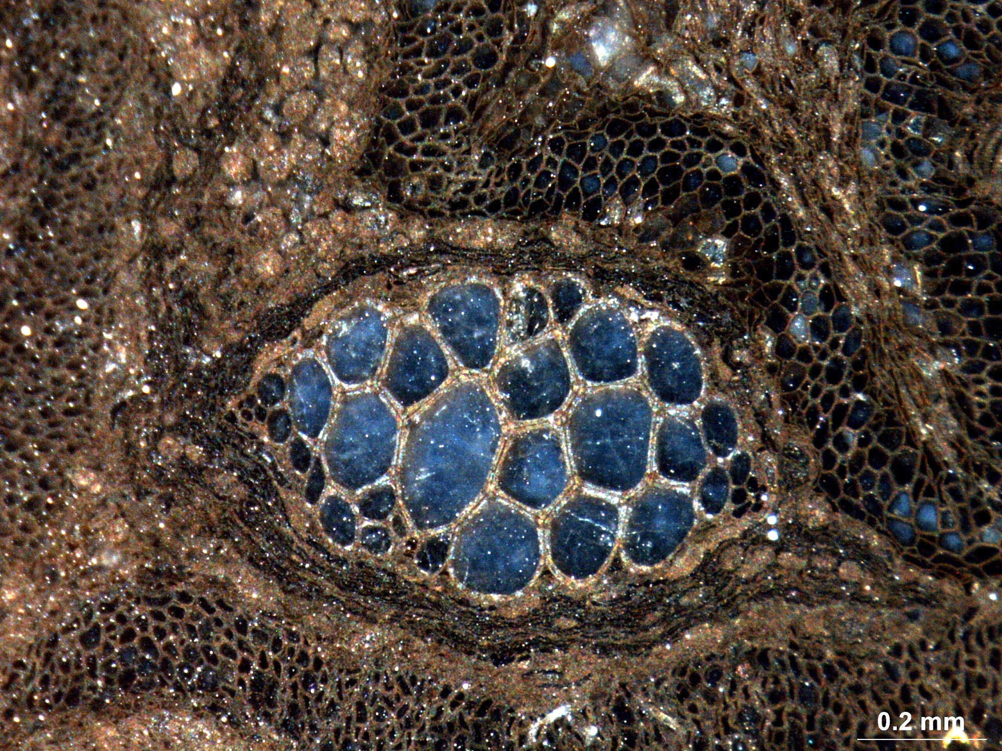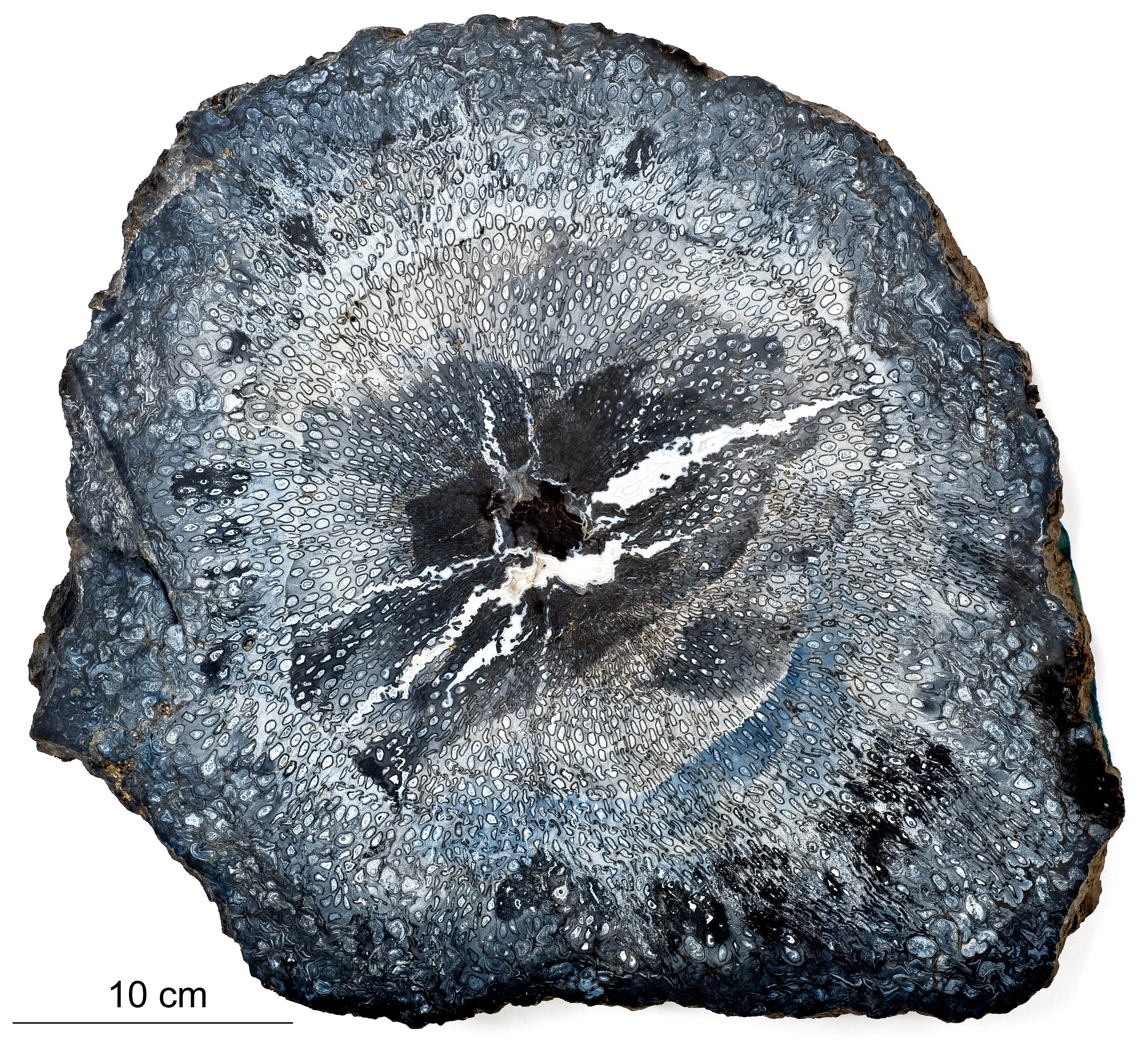 Ein versteinerter, schwarzer Baumstamm hat es Professor Ronny Rößler, Direktor des Museums für Naturkunde Chemnitz und Honorarprofessor für Paläobotanik an der TU Bergakademie Freiberg, angetan. Das Besondere daran wird erst beim Blick ins Mikroskop deutlich: Im fossilen Baumstamm aus Manebach wurden während des Prozesses der Versteinerung Mikrometer kleine Pflanzenzellen mit Quarz gefüllt und auf diese Weise dreidimensional konserviert. Und mehr noch: In diesen Zellen entdeckte das Team um Prof. Ronny Rößler eine bisher unbekannte fossile Mikrowelt – Spuren von Pilzen und Ausscheidungen von Tieren, die in dem Baumstamm lebten. „Diese fossilen Kleinstlebewesen innerhalb der Gewebe erschließen der Paläontologie einen Mikrokosmos ökologischer Beziehungen zwischen Pflanzen, Tieren und Pilzen, der für die Perm-Zeit, die den Zeitraum von vor ca. 299 Mio. Jahren bis vor ca. 251 Mio. Jahren umfasst, bisher weitgehend unerforscht ist“, erklärt Steffen Trümper, der an der TU Bergakademie Freiberg und am Museum für Naturkunde Chemnitz zu den Funden in Manebach promoviert.