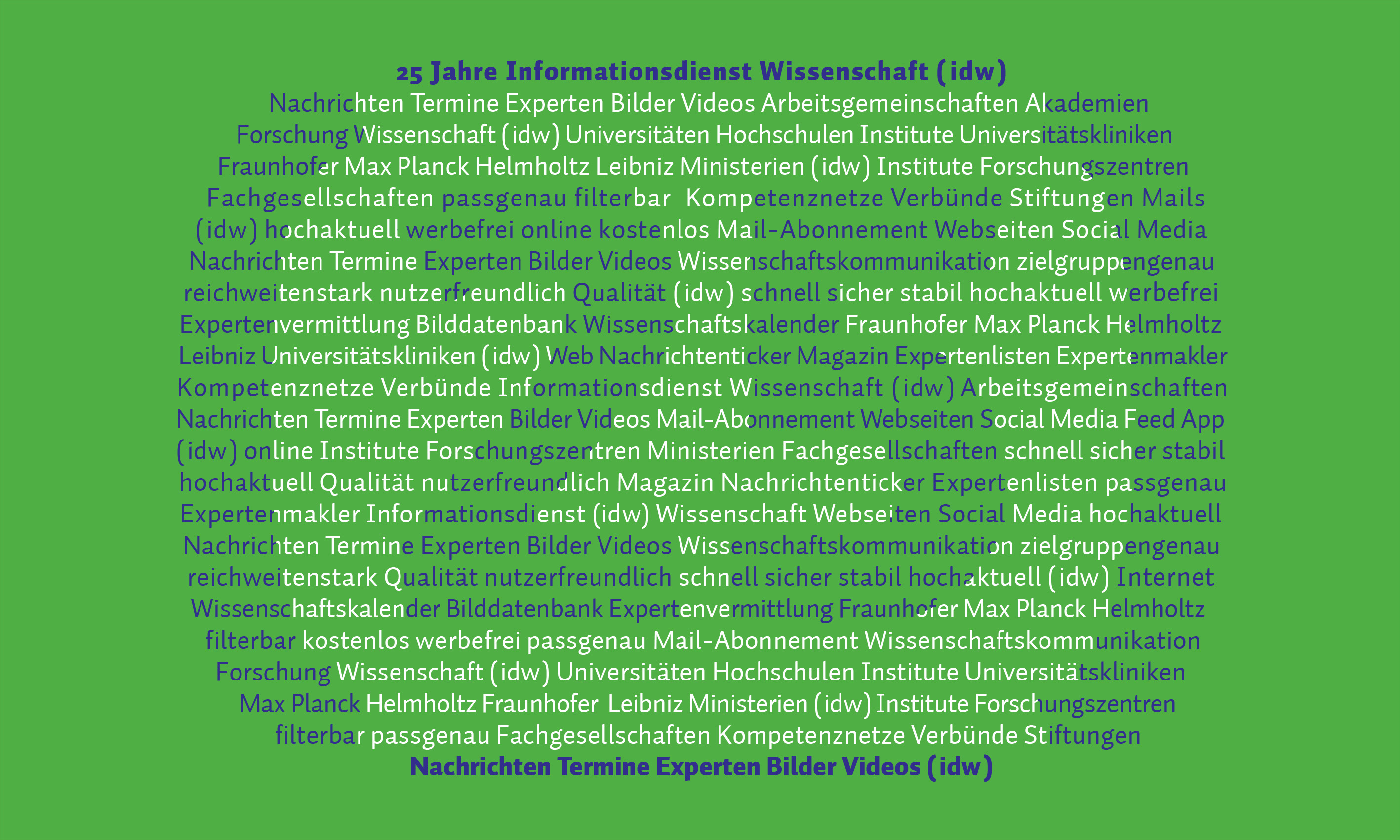 Der Informationsdienst Wissenschaft e. V. (idw) ist das größte Nachrichtenportal für Wissenschaft und Forschung im deutschsprachigen Raum. Er bringt Wissenschaft und Öffentlichkeit zusammen, indem er über 1.000 Mitgliedseinrichtungen aus der Wissenschaft ermöglicht, Nachrichten und Termine zu veröffentlichen sowie Wissenschaftlerinnen und Wissenschaftler an Medien zu vermitteln. Er betreibt ferner eine Wissenschaftsbilder-Datenbank. Der idw hat rund 40.000 AbonnentInnen, darunter mehr als 8.000 JournalistInnen.