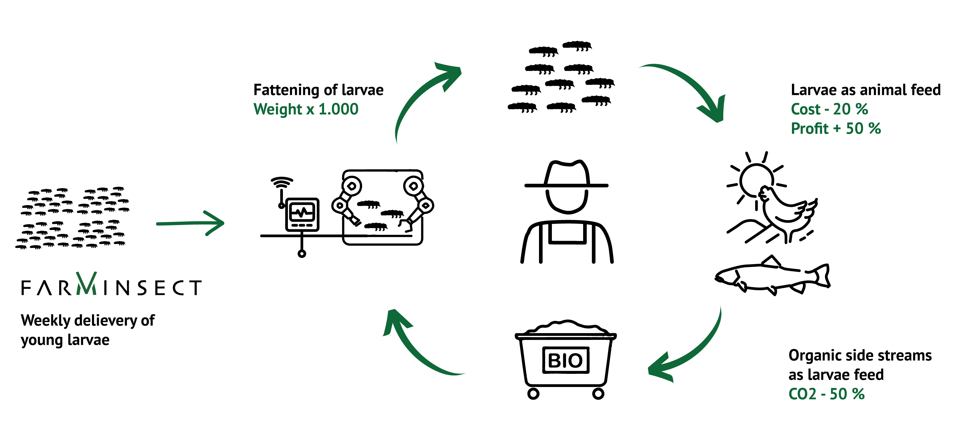 The founders of FarmInsect (Wolfgang Westermeier, Thomas Kühn, and Andre Klöckner) have developed their company based on the principle of using agricultural biomass in a circular economy. Accordingly, residues that accumulate in the region, such as harvest or peeling residues from an agricultural operation or residues from the regional food industry, such as spent grain or bread, can be used to fatten and feed insect larvae, which can in turn be used as feed for livestock animals.
