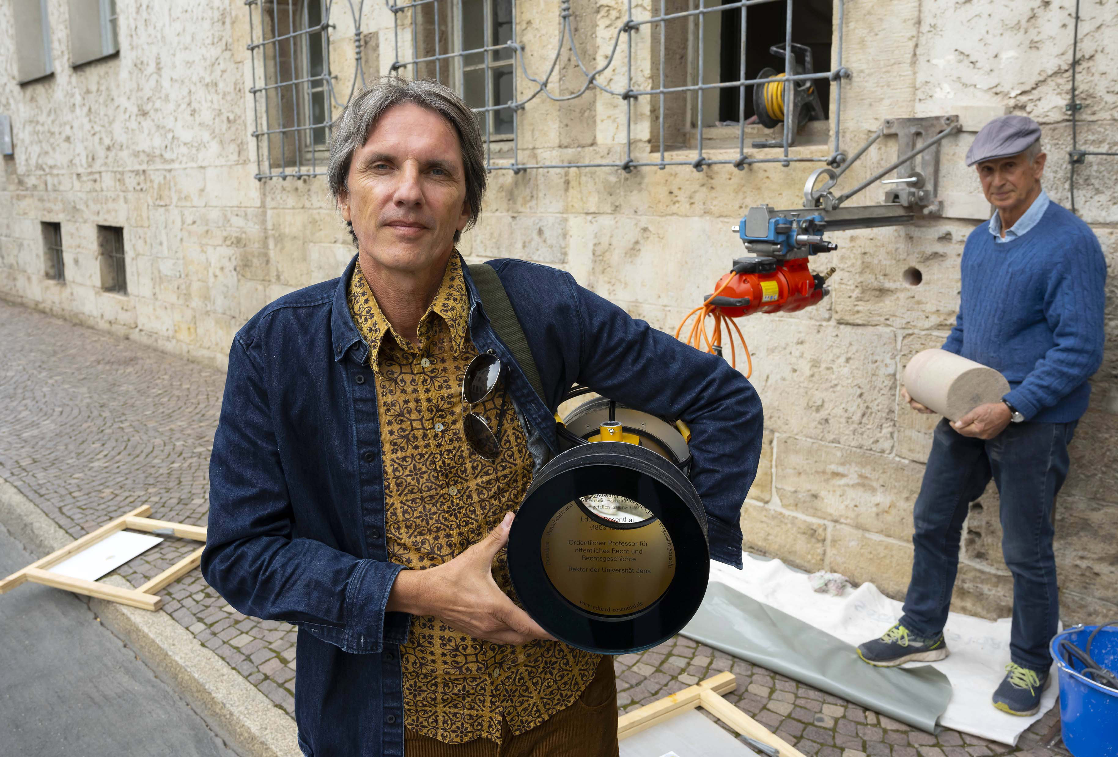 Kein Sockel mit Statue, dafür unauffällige Bohrlöcher in drei markanten Gebäuden, keine feierliche Denkmalsenthüllung, dafür laufen die – Corona-bedingt zahlenmäßig limitierten – Gäste nach kurzer Eröffnung in der Universitätsaula auf den Spuren Eduard Rosenthals in kleinen Gruppen durch Jena. Sie erleben mit den Künstlern Horst Hoheisel und Andreas Knitz Lärm und Staub bei der „Erkundungsbohrung“ durch die Fassade des Universitätshauptgebäudes und erkunden, von Schauspielerinnen und Schauspielern geführt, das bis in die Gegenwart reichende Vermächtnis des deutsch-jüdischen Gelehrten.