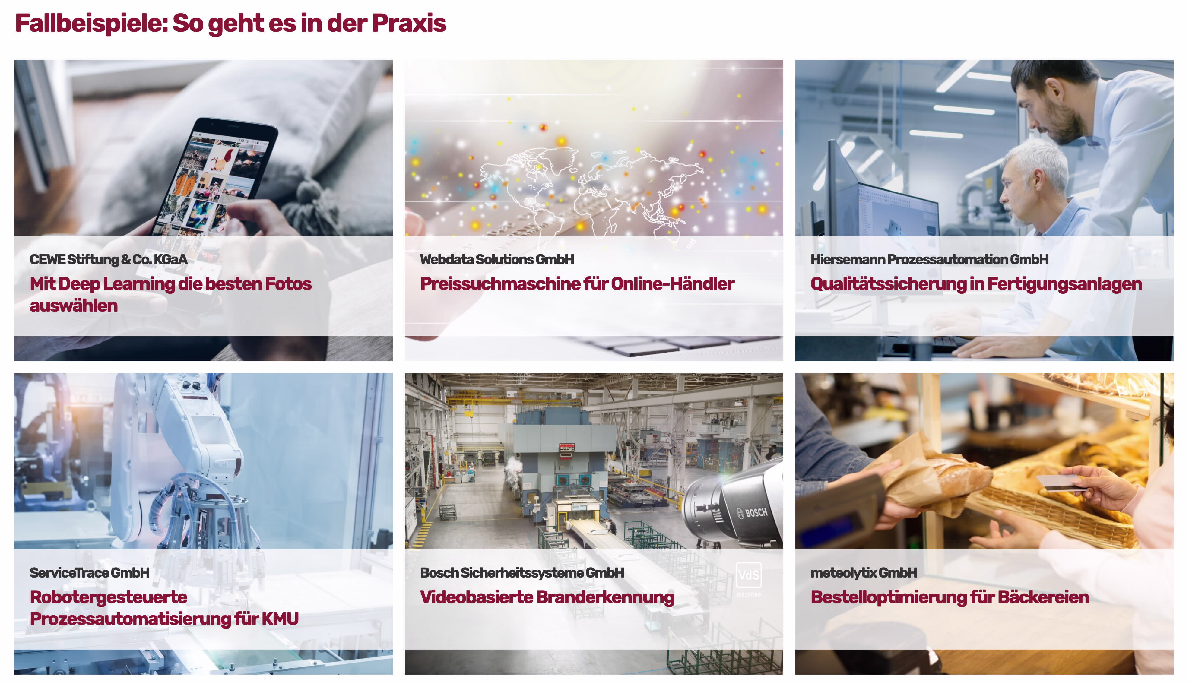 Auf ihrer Website www.ki-und-kmu.de stellt die Plattform Lernende Systeme exemplarisch Anwendungen aus der mittelständischen Praxis vor: Ein selbstlernendes Computersystem, das Bäckereien tagesaktuell bei ihrer Absatzplanung unterstützt. Eine Software, die mit Hilfe von Methoden des maschinellen Lernens die Fertigungsqualität hochpräziser Bauteile sichert. Oder eine intelligente Preissuchmaschine, die Händler unterstützt, den besten Marktpreis für ihre online vertriebenen Produkte festzulegen.