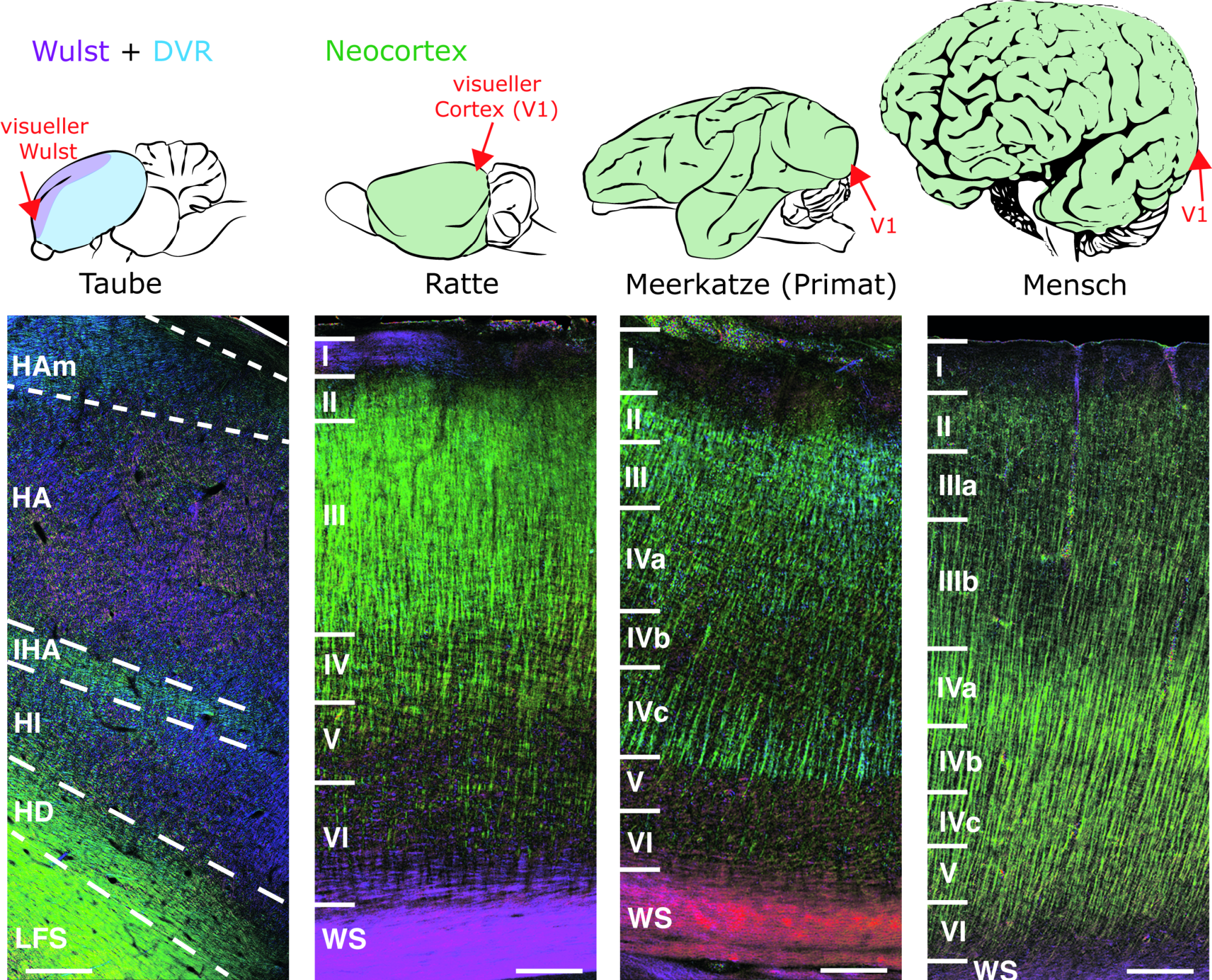 Und tatsächlich, die Gehirne von Vögeln und Säugetieren sehen sich in ihrer Organisation überraschend ähnlich. In mehreren Experimenten gelang den Forschern um Dr. Christina Herold (C. u. O. Vogt Institut für Hirnforschung, HHU) und Dr. Martin Stacho (RUB) nun der Nachweis dafür. Denn auch im Vogelhirn verlaufen die Fasern horizontal und vertikal, genauso wie im Neocortex der Säugetiere.