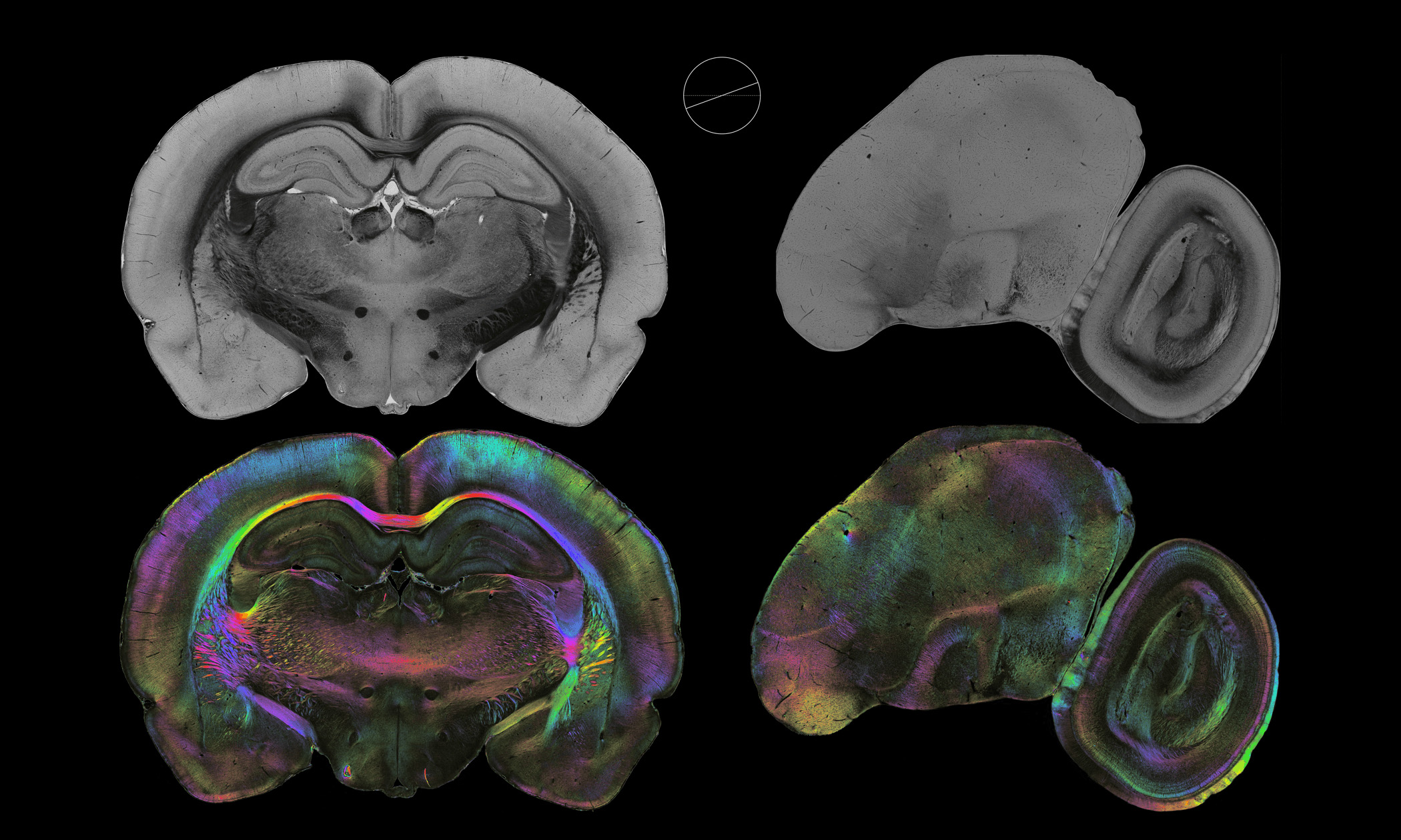 Im ersten Schritt kam eine neue, am Forschungszentrum Jülich entwickelte Methode zum Einsatz: Das sogenannte 3D Polarized Light Imaging, kurz 3D-PLI, ist in der Lage, Verlauf und die Ausrichtung von Nervenfasern, in denen Signale weitergeleitet werden, für das gesamte Gehirn darzustellen.