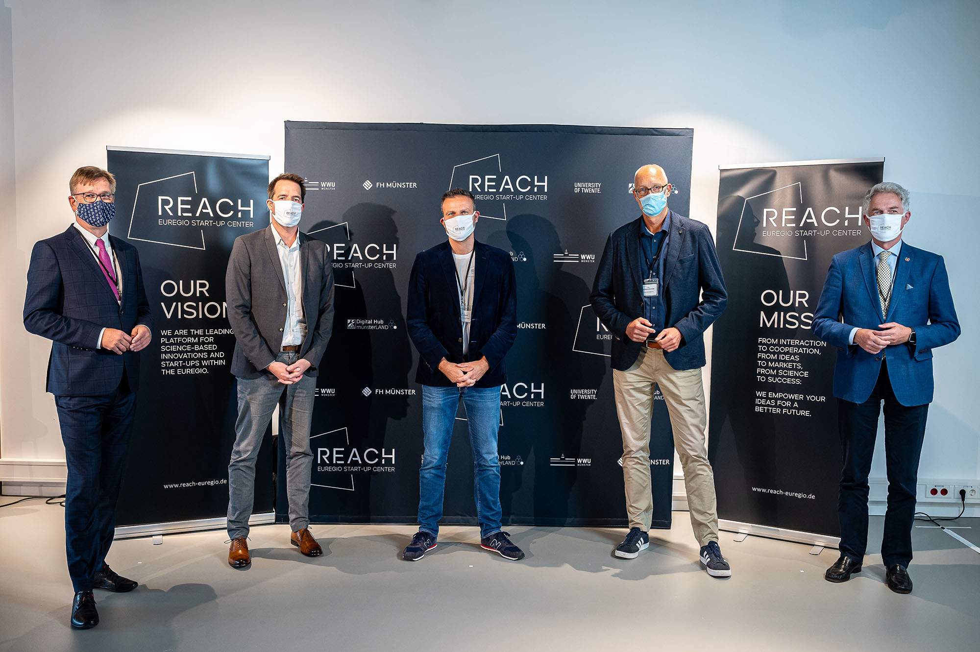 Gemeinsam Entrepreneurship-Strukturen schaffen, zusammen Gründungsideen entwickeln: Unter diesem Motto stand die gestrige Vorstellung des neuen Euregio Start-up-Centers „REACH“. Vertreter der Universität Münster und der FH Münster diskutierten mit ihren Kooperationspartnern von der Universität Twente und dem „Digital Hub münsterLAND“ sowie mit Unternehmensvertretern aus der Region und Gründern über die Frage, wie Innovationen aus den Hochschulen für die Region gesichert und so Arbeitsplätze geschaffen werden können. „Die Universität Münster, die FH Münster und die Universität Twente ergänzen sich mit ihrer exzellenten Forschung“, betonte der Rektor der Universität Münster, Prof. Dr. Johannes Wessels. „Mit dieser länderübergreifenden Kooperation für wissenschaftsbasierte Ausgründungen schaffen wir Hochschulen eine gemeinsame Plattform, um Forschungsergebnisse zukünftig besser in Unternehmen zu überführen.“