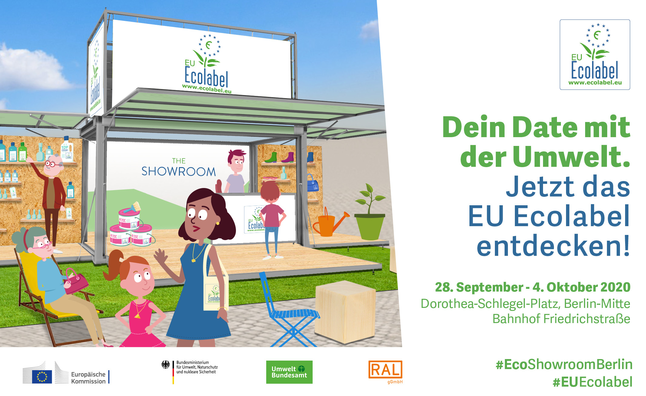 Vom 28. September bis zum 4. Oktober 2020 setzen die Europäische Kommission, das Bundesumweltministerium, das Umweltbundesamt und RAL Gütezeichen in Berlin mit dem Showroom zum EU Ecolabel ein Zeichen für mehr Umweltschutz. Der Pavillon steht in zentraler Lage am Bahnhof Friedrichstraße auf dem Dorothea-Schlegel-Platz.