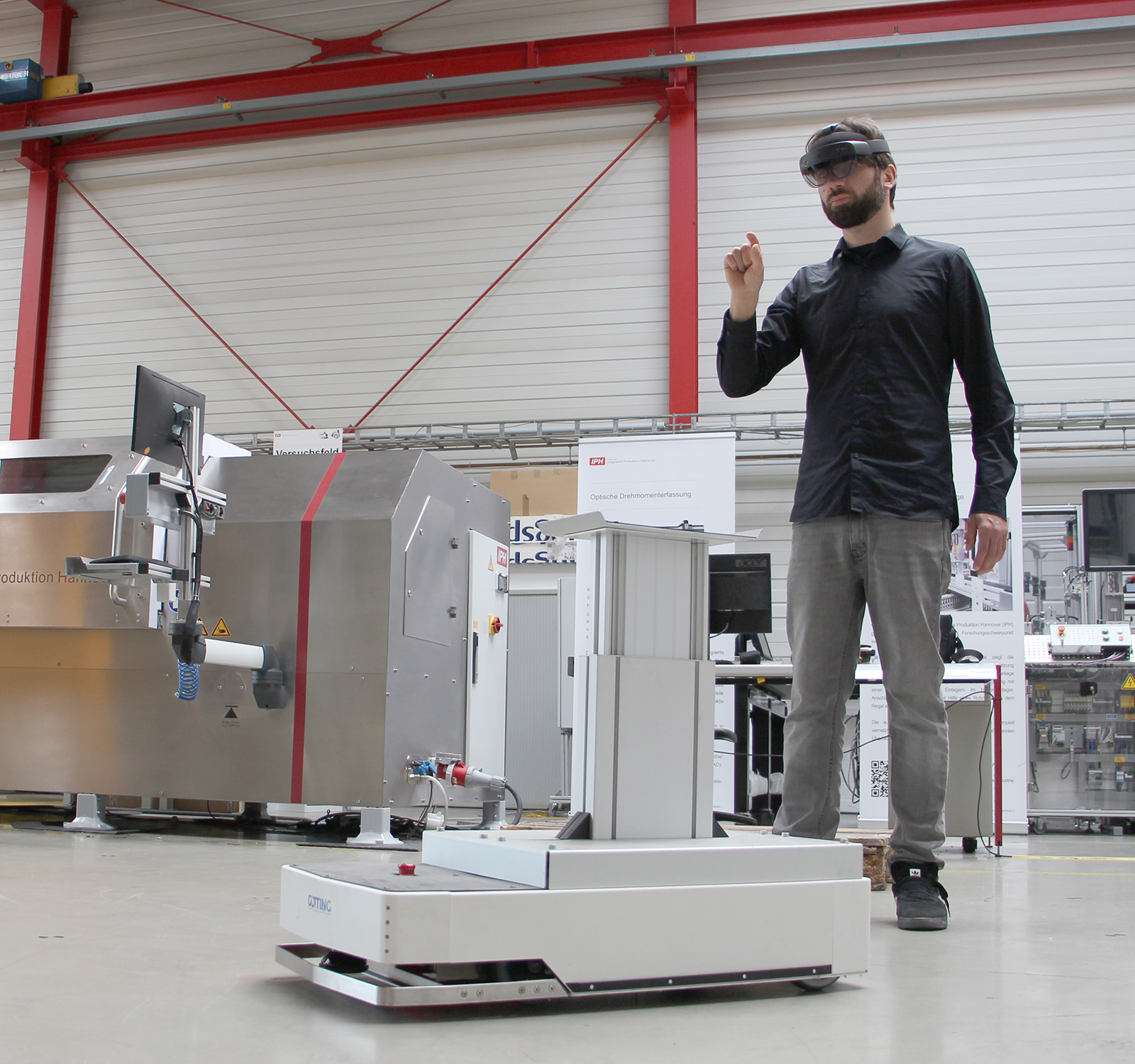 Über Blickkontakt, Sprache und Gesten kommunizieren wir in Zukunft mit Maschinen. Wissenschaftler vom Institut für Integrierte Produktion Hannover (IPH) gGmbH haben eine Software entwickelt, mit der sich Fahrerlose Transportfahrzeuge (FTF) intuitiv steuern lassen. Alles, was dafür nötig ist, ist eine AR-Brille.