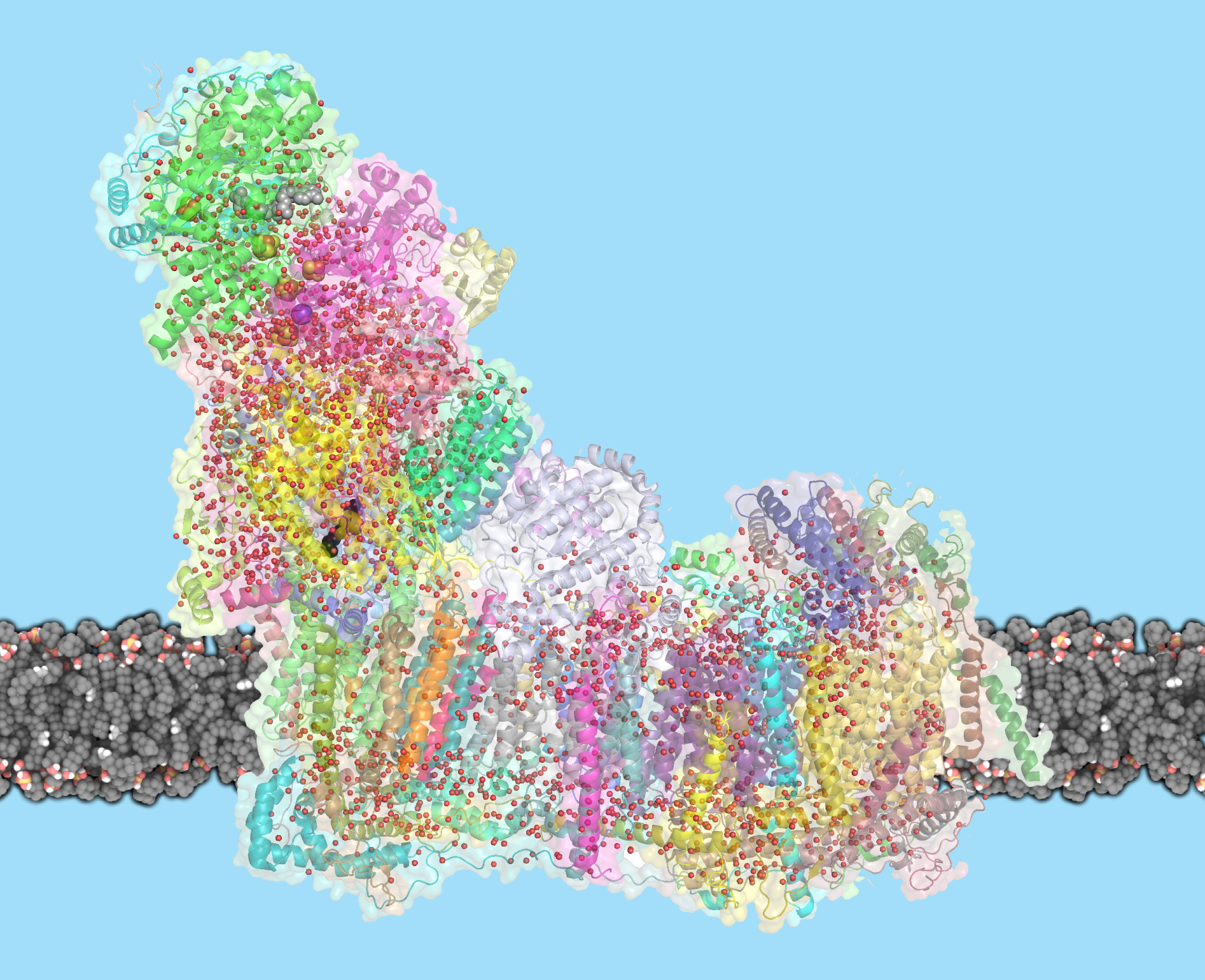 Complex I is the first enzyme in the respiratory chain, a series of protein complexes in the inner mitochondrial membrane. The respiratory chain is responsible for most of the cell’s energy production. In this chain, three membrane proteins set up a gradient of protons, moving them from the cell’s cytoplasm into the mitochondrial inner space, called the matrix. The energy for this process comes mostly from the electron transfer between NADH molecules, derived from the food we eat, and oxygen that we breathe. ATP synthase, the last protein in the chain, then uses this proton gradient to generate ATP. Complex I is remarkable not only because of its central role in life, but also for its sheer size: with a molecular weight of 1 Megadalton, the eukaryotic complex I is one of the biggest membrane proteins. Its size also makes complex I hard to study. In 2016, Sazanov and his group were the first to solve the structure of mammalian complex I, following on their 2013 structure of a simpler bacterial enzyme. But the mechanism by which complex I moves protons across the membrane has remained controversial. “One idea was that a part of complex I works like a piston, to open and close channels through which protons travel”, explains Sazanov. “Another idea was that residues at the center of complex I act as a driver. It turns out that an even more unusual mechanism is at work.”