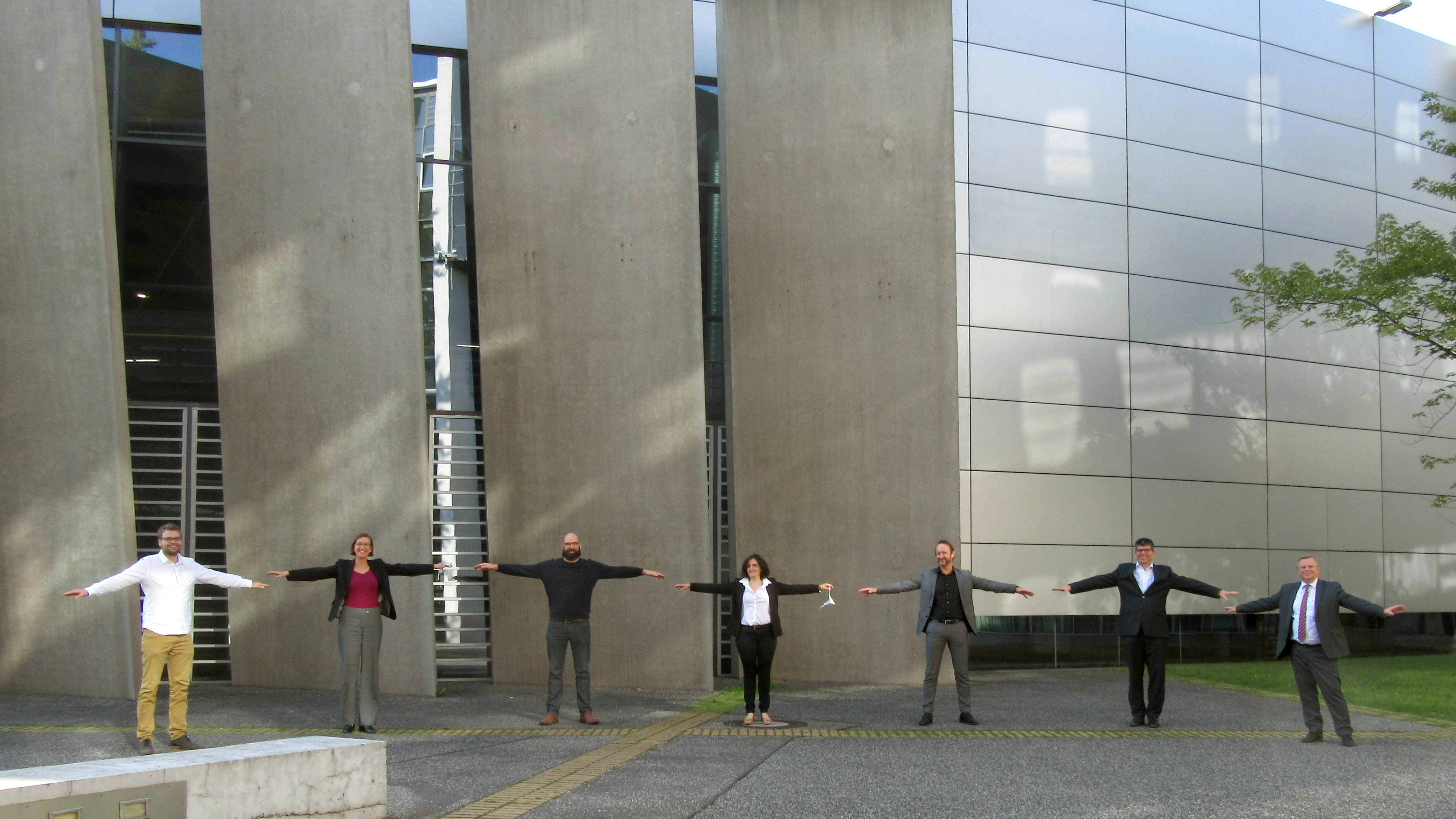 Die Teilnehmer nach der Unterzeichnung des Kooperationsvertrags zwischen IKZ und HZB in Corona-konformen Abstand: (von links nach rechts) Dr. Andreas Popp (IKZ), Dr. Manuela Urban (FVB), Dr. Peter Gaal (IKZ), Prof. Dr. Chatherine Dubourdieu (HZB), Prof. Dr. Thomas Schröder (IKZ), Prof. Dr. Bernd Rech (HZB), Thomas Frederking (HZB)