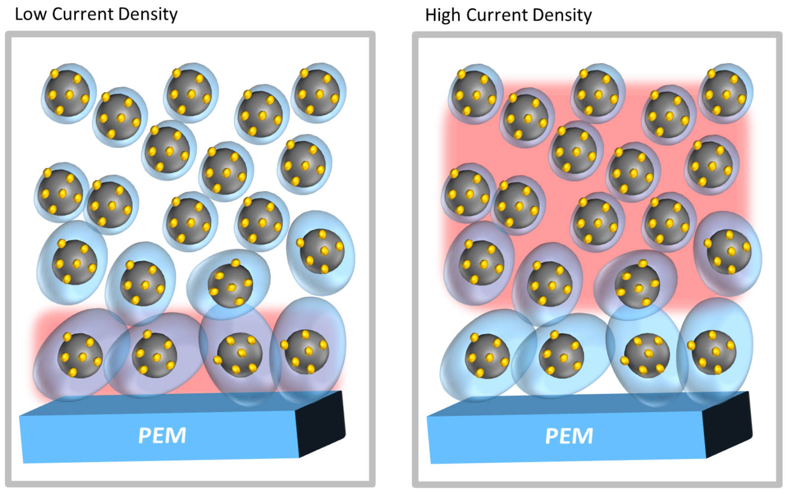 Screen printing – a technology used in the production of solar cells for decades – enables the industrial application of homogeneous layers as stacks and thus the realization of innovative, structured MEA architectures. In this context, Fraunhofer ISE has developed continuous ionomer-graduated catalyst layers, which enable a significantly improved power density during the operation of fuel cells. At low current densities, power generation takes place near the membrane and is not yet limited by insufficient oxygen. For better proton conductivity into the catalyst layer, the ionomer content can be increased here (see figure left). At high current densities, the reactive zone moves deeper into the catalyst layer and the oxygen diffusion resistance limits the power. Because of this, the researchers selectively incorporated fewer ionomers in these zones in order to minimize the oxygen diffusion resistance (right).