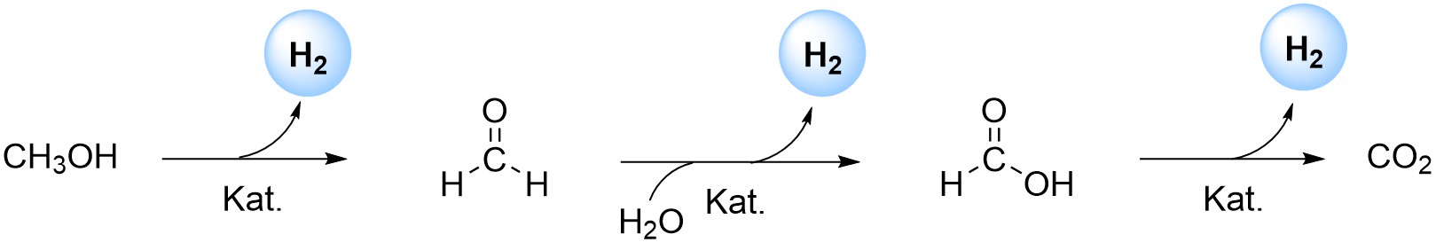 Für ihren Teil analysierten die LIKAT-Forschenden, wie der Ruthenium-Katalysator in der Methanollösung arbeitet, um zu H2 und CO2 zu kommen, also den Wasserstoff wieder freizusetzen. Bei diesen „mechanistischen Untersuchungen“, wie sie die Arbeiten nennen, entdeckten sie drei kaskadenartig verbundene Schritte. Am Ende der ersten beiden Schritte entsteht jeweils schon ein Teil des Wasserstoffs und zusätzlich ein Zwischenprodukt, ein sogenanntes Intermediat. Im ersten Schritt ist es Formaldehyd, das im Beisein des Katalysators dann im zweiten Schritt weiterverarbeitet wird.