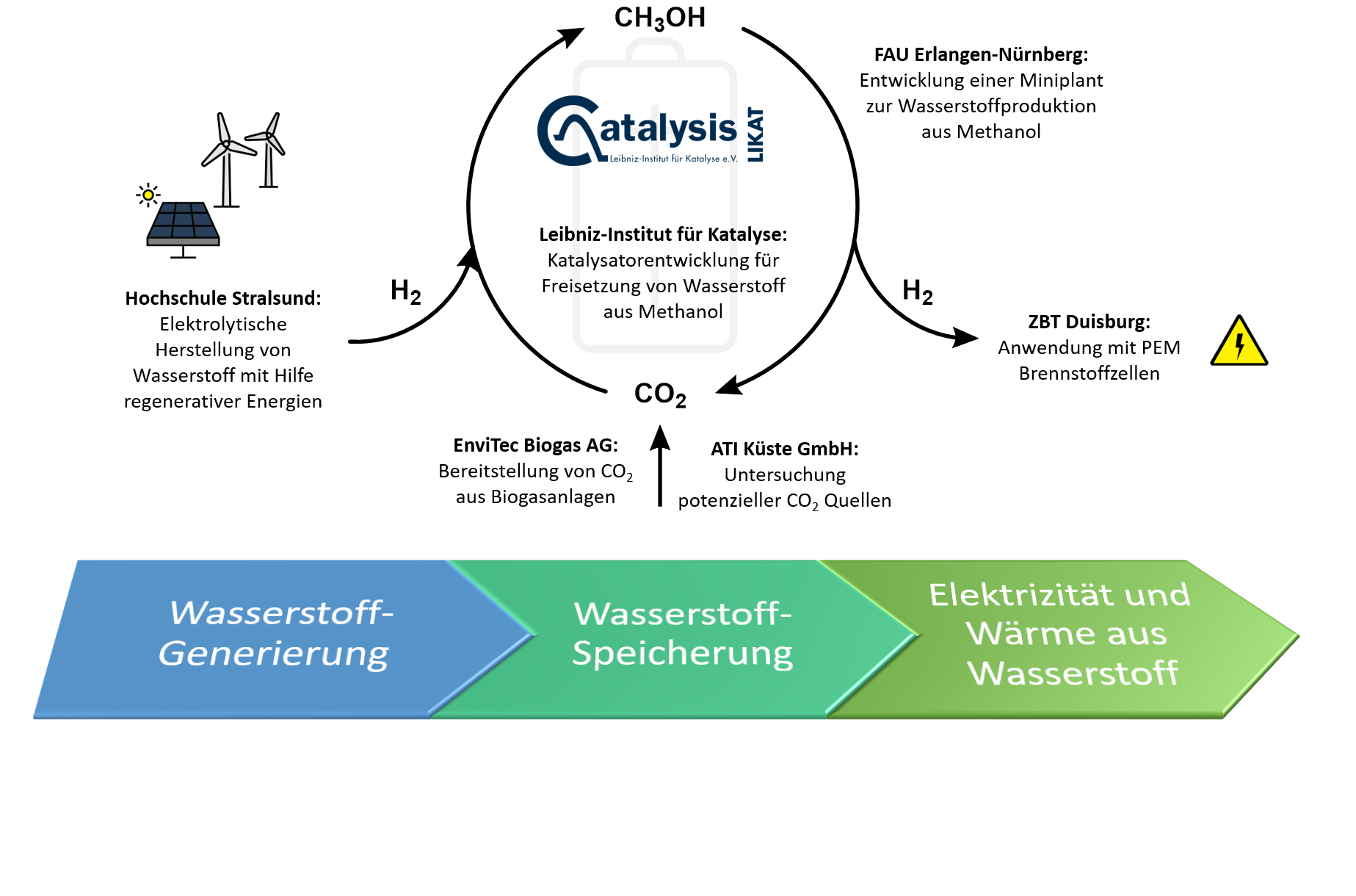 So funktioniert Metha-Cycle: Windkrafträder (wahlweise Photovoltaik-Anlagen) produzieren Elektroenergie. Mit diesem Strom wird aus Wasser elektrolytisch Wasserstoff erzeugt, der wiederum mit CO2 in Methanol umwandelt wird. Methanol, einfachster Vertreter in der Gruppe der Alkohole, fungiert somit als Speicher für Wasserstoff, wie es Chemiker seit langem vorschlagen. Dr. Junge: „Methanol lässt sich im Unterschied zu Wasserstoff gut handhaben und auch über weite Strecken transportieren.“ Bei Bedarf wird Methanol in H2 rückverwandelt und direkt im Anschluss in einer Brennstoffzelle zur Stromerzeugung genutzt.