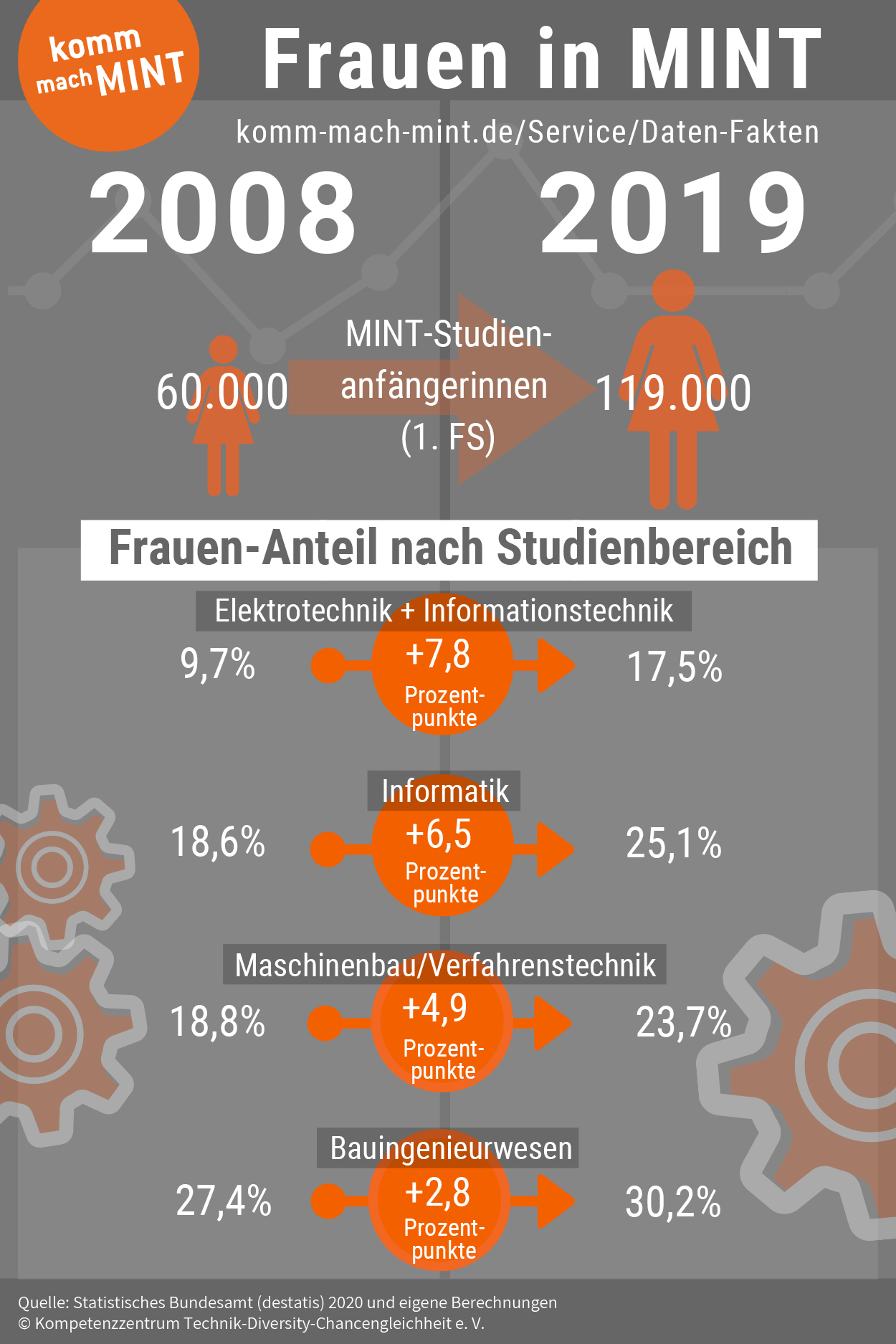 Mehr Frauen für MINT begeistern – dafür setzt sich der Nationale Pakt für Frauen im MINT-Berufen „Komm, mach MINT.“ ein. Das Netzwerk mit mehr als 360 Partnerinnen und Partnern motiviert seit 2008 für Karrieren in MINT. Statistiken zur Entwicklung der MINT-Studierendenzahlen sind ein wichtiges Indiz für die Wirkung solcher Initiativen. Deshalb wertet „Komm, mach MINT.“ jährlich die Daten des Statistischen Bundesamtes für die beiden MINT-Fächergruppen Ingenieurwissenschaften und Mathematik/Naturwissenschaften aus und macht diese in einem Datentool für alle Interessierten zugänglich. Das kostenlose Datentool ermöglicht eine komfortable Zusammenstellung individueller Datenreporte zu Studienanfänger/innen, Studierenden insgesamt und Absolvent/innen in MINT. Es ist unter https://www.komm-mach-mint.de/service/mint-datentool abrufbar.