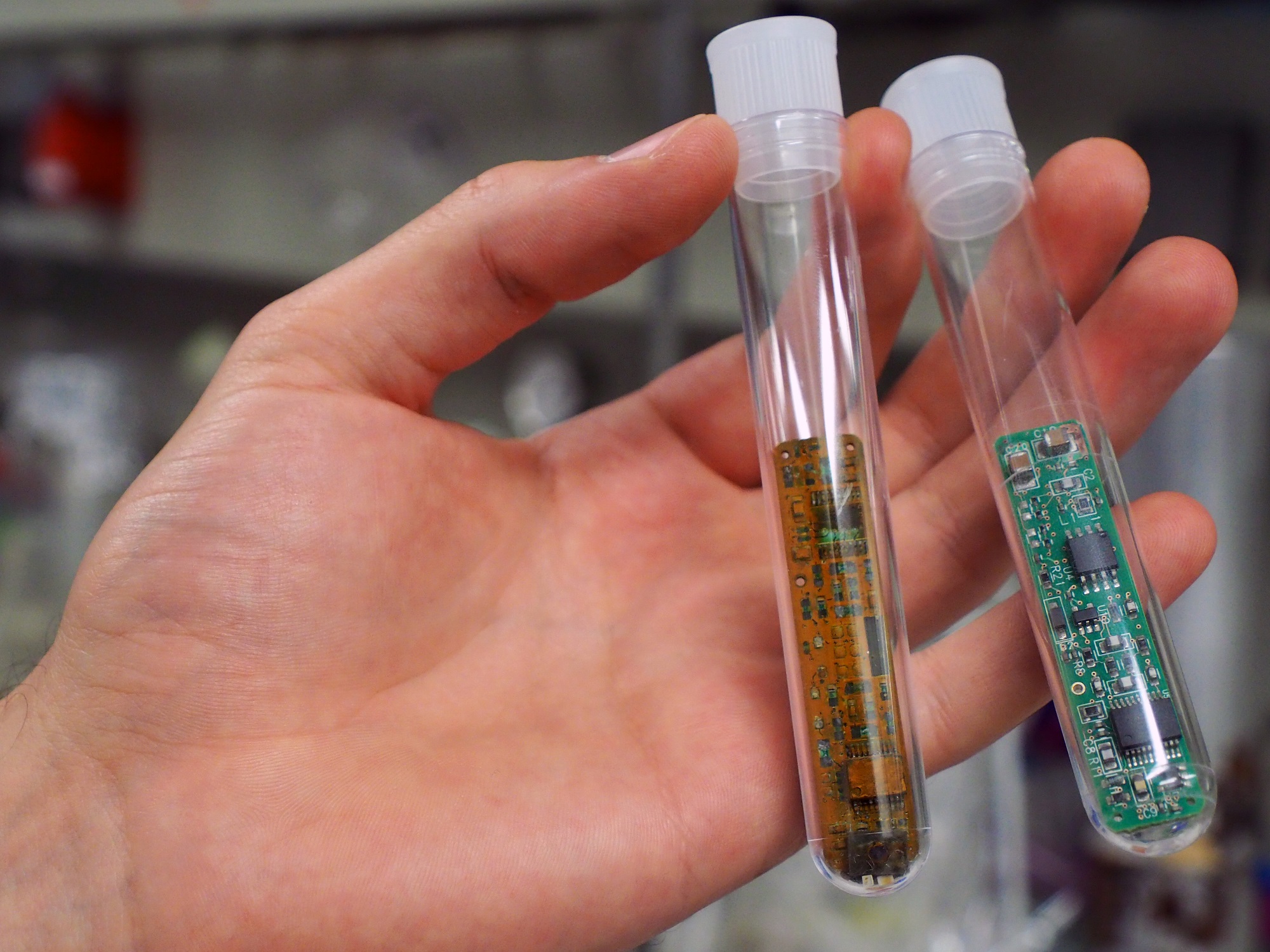 Ein ausgedienter Computerchip liegt in einer wässrigen Lauge im Reagenzglas. Zunächst passiert fast drei Wochen lang nicht sehr viel am Versuchsstand von Benjamin Monneron im Labor der Arbeitsgruppe Umweltmikrobiologie der TU Bergakademie Freiberg. Doch dann fallen die einzelnen Bauteile von der Leiterplatte ab und sinken im Reagenzglas zu Boden als Benjamin Monneron daran rüttelt. Der Doktorand hat das alte Elektronikteil vor 20 Tagen in eine wässrige Lauge gelegt, die mit dem Mikroorganismus Acidithiobacillus ferrooxidans versehen ist.