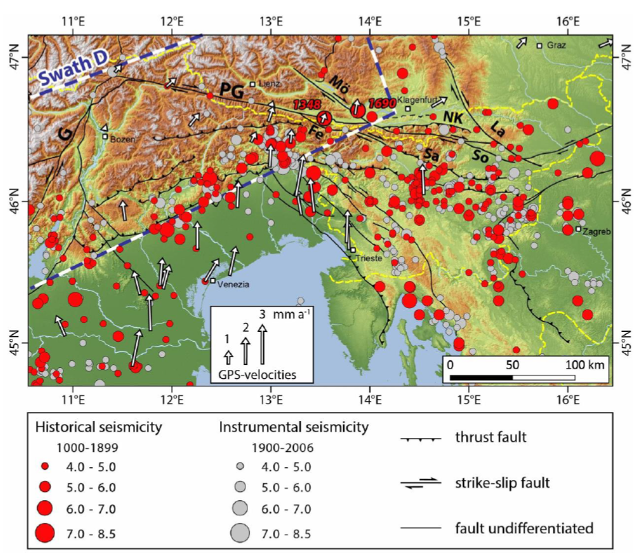 Im Anhang der Pressemitteilung befindet sich eine topographische Karte der südöstlichen Alpen mit Lage wichtiger tektonischer Verwerfungen (schwarze Linien). Obwohl es sich um ein wichtiges tektonisches Lineament in den Alpen handelt, zeigt das östliche Periadriatische Verwerfungssystem (Linie PG) im Vergleich zu den östlichen Südalpen und dem nördlichen Dinarischen Gebirge sowohl in den historischen als auch in den instrumentellen Daten viel weniger Erdbeben an (rote bzw. graue Punkte).