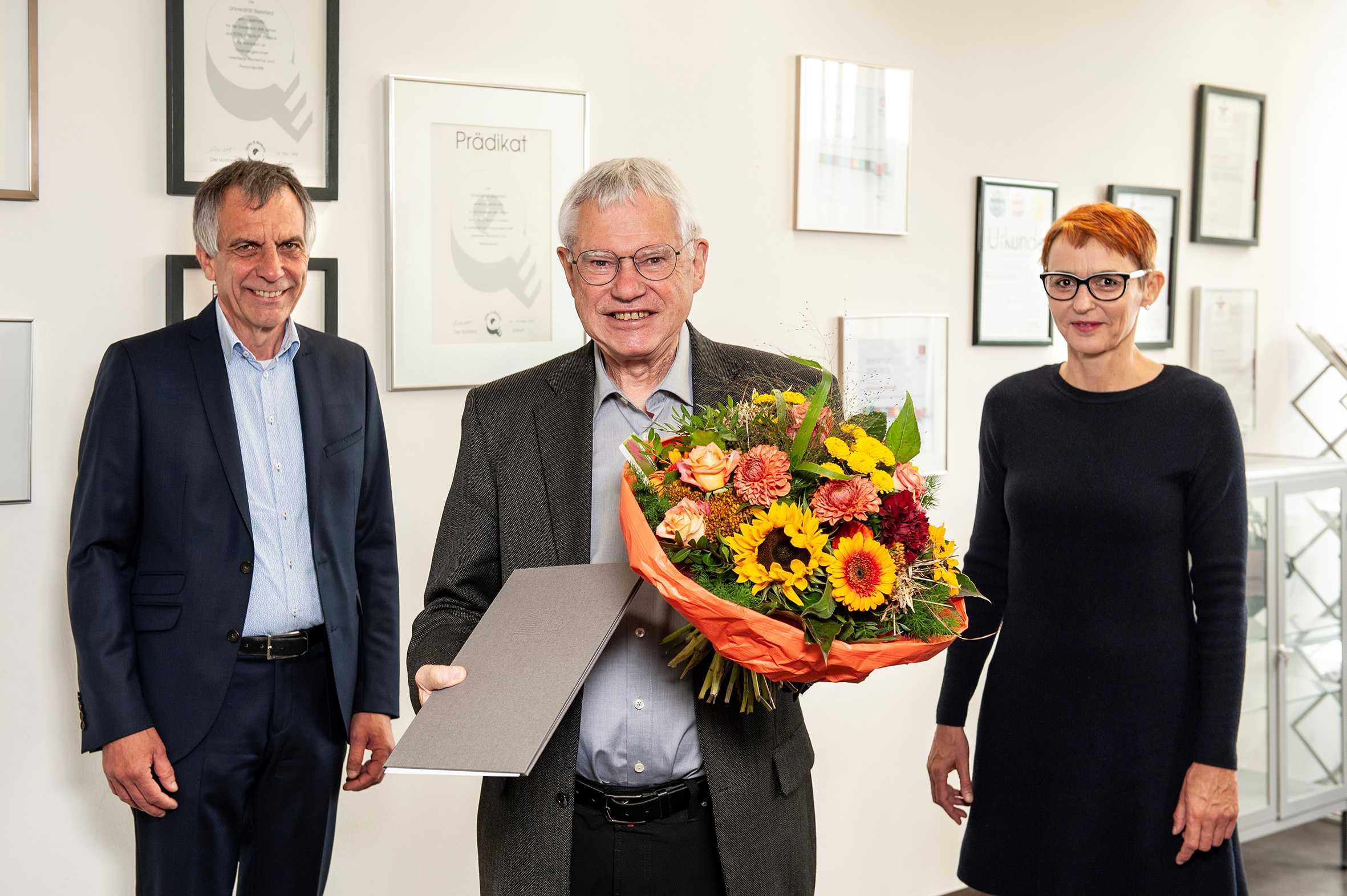 Über ein ganz besonderes Geschenk zum 80. Geburtstag kann sich Professor Dr. Alfred Pühler freuen: Die Universität Bielefeld ehrt seine Verdienste für die Forschung auf dem Gebiet der Biotechnologie und für die Universität mit der Verleihung der Ehrensenatorwürde. Rektor Professor Dr. Ing. Gerhard Sagerer und die stellvertretende Senatsvorsitzende Dr. Beate Lingnau überreichten ihm jetzt die Urkunde.