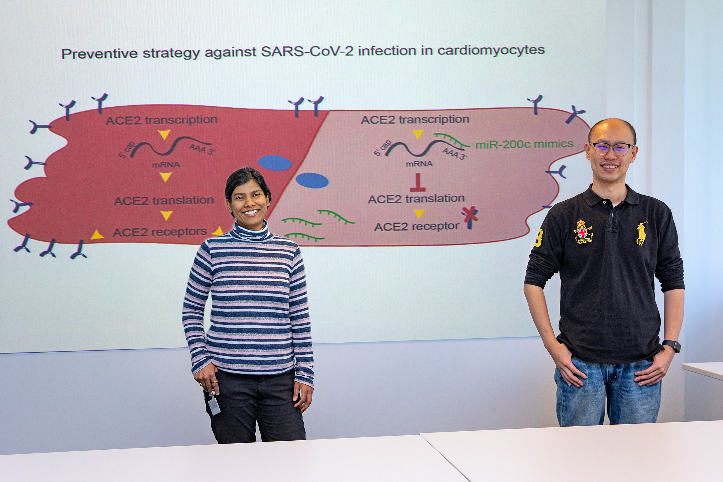 Infektionen mit Bakterien und Viren sind eine zusätzliche Belastung für das Herz-Kreislauf-System. Das gilt auch für das Coronavirus SARS-CoV-2. Doch das Virus scheint nicht nur bei älteren Menschen mit kardiovaskulären Grunderkrankungen zu Herzschädigungen zu führen. Auch nur leicht erkrankte, jüngere Patientinnen und Patienten können nach überstandener COVID-19-Infektion entzündliche Veränderungen im Herzmuskel oder im Herzbeutel aufweisen. Die Ursache dafür liegt im Angiotensin-umwandelnden Enzym 2 (angiotensin-converting enzyme 2, ACE2). Diese Bindungsstelle ist das Einfallstor für SARS-CoV 2 in das Lungengewebe. Weil sich ACE2 auch in Herzmuskelzellen befindet, können die Viren auch das Herz befallen und dort massive Entzündungen auslösen. Eine Forschungsgruppe des Instituts für Molekulare und Translationale Therapiestrategien der Medizinischen Hochschule Hannover (MHH) hat nun eine Möglichkeit entdeckt, diesen Weg für das Coronavirus zu blockieren. Die Studie unter der Leitung von Institutsdirektor Professor Dr. Dr. Thomas Thum Dr. Christian Bär ist im Journal of Molecular and Cellular Cardiology veröffentlicht. Erstautoren sind Dongchao Lu und Shambhabi Chatterjee, PhD.