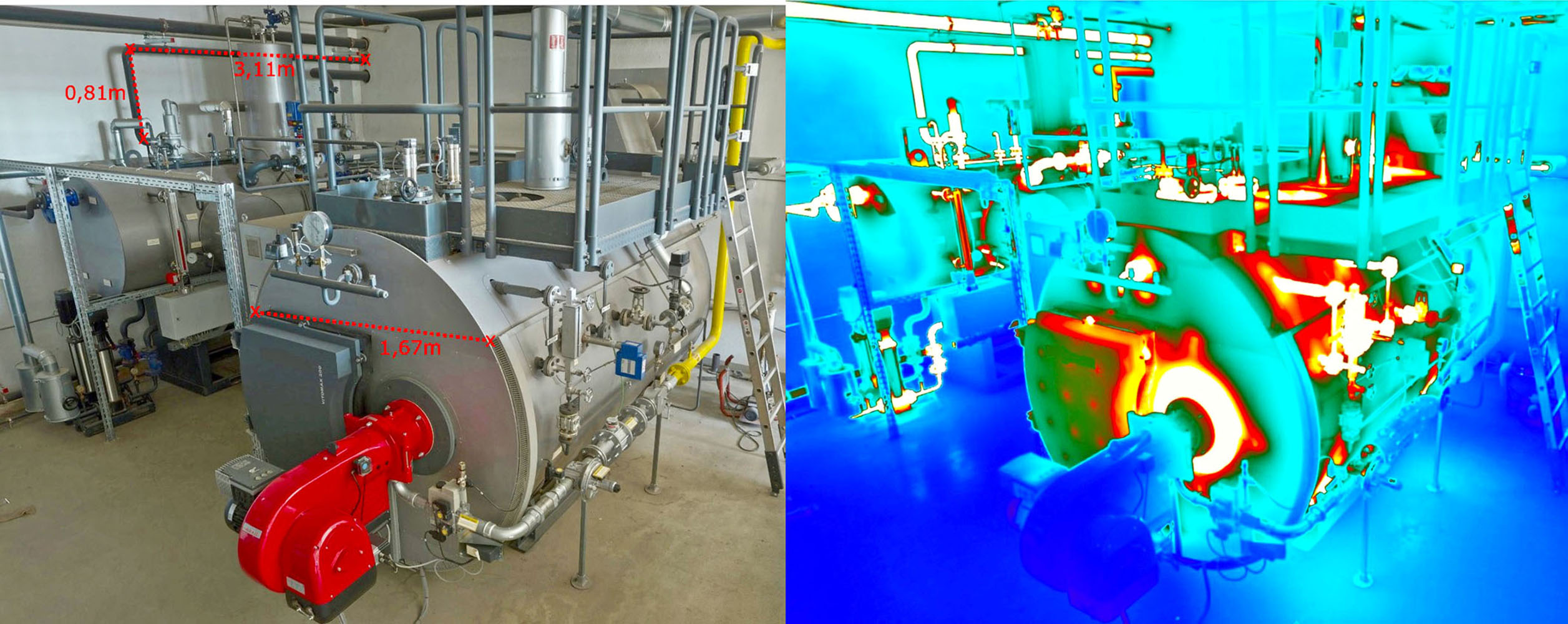 Ein Teil der hierbei erhaltenen Ergebnisse wird in den Abbildungen gezeigt: Links ist die hochauflösende Aufnahme zu sehen, während rechts derselbe Bildausschnitt im infraroten Thermografiebereich dargestellt ist. Im Thermogramm erscheinen die heißen Oberflächen rot bzw. weiß, weshalb sie einfach zu identifizieren sind. Anschließend kann durch eine virtuelle stereophotogrammetrische Bildverarbeitung die Oberfläche vermessen und somit der Energieverlust beziffert werden, der sich unter anderem aus Oberflächentemperatur, Abstrahloberfläche und Energiekosten zusammensetzt. Pro Standpunkt war lediglich eine 15-minütige Messung nötig, wobei die laufende Produktion nicht beeinträchtigt wurde. Aufgrund der einfachen Bedienung der Instrumente und der hohen Datenqualität ist das Verfahren vielseitig einsetzbar, wie z.B. bei der Gebäudesanierung, dem Brandschutz, der Schadensdetektion oder der Qualitätskontrolle.