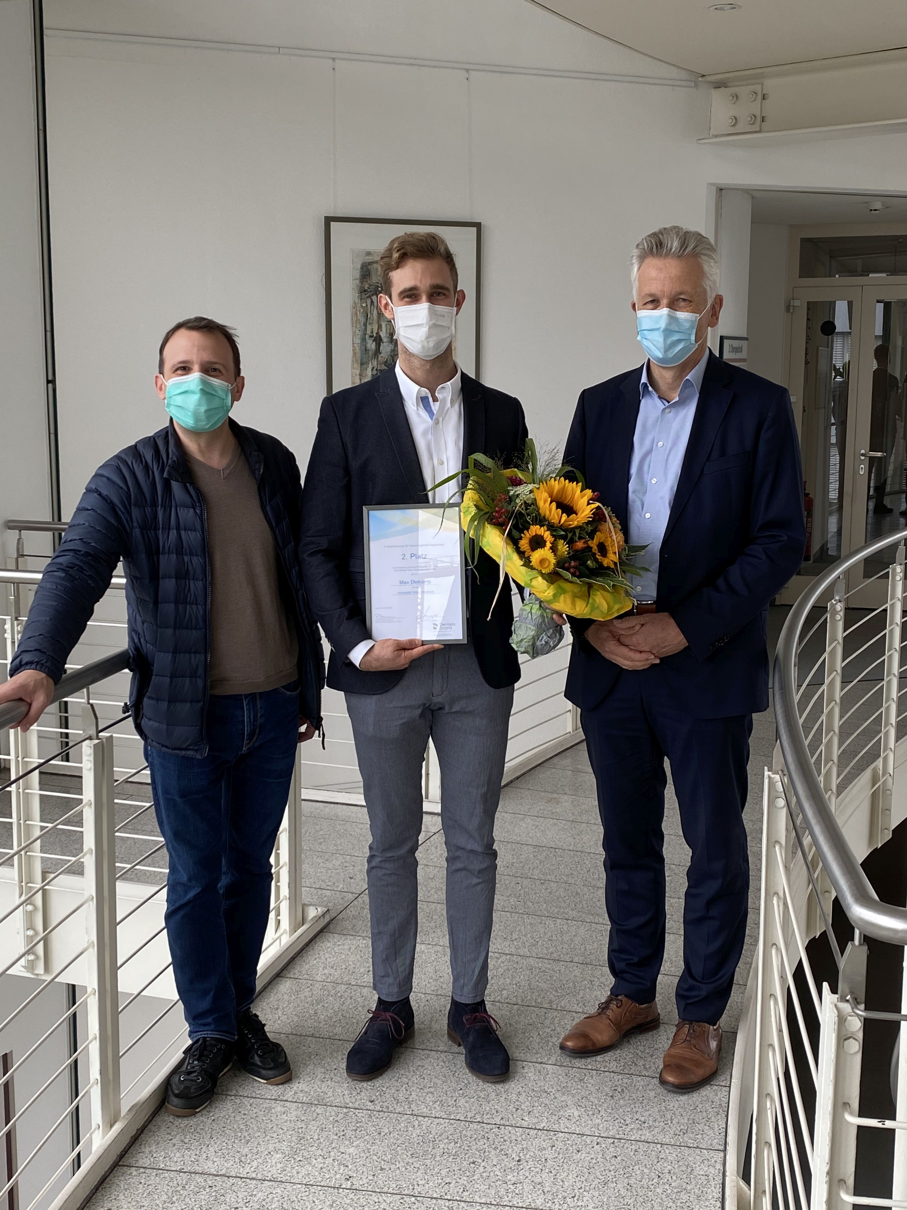 Max Diekamp hat bei der Ausschreibung des „Clinical Case Contest 2019/20“ für die Länder Deutschland, Österreich und Schweiz den zweiten Preis gewonnen. Damit belegen Studierende der Universität Witten/Herdecke (UW/H) bereits zum 7. mal einen Spitzenplatz in dem von der Firma Dentsply Sirona gesponserten renommierten Wettbewerb. Ende September nahm der Student, der gerade sein zahnmedizinisches Staatsexamen absolviert, die Ehrung aus den Händen von Siegmar Schwegler, Professional Service Manager Universitäten bei Dentsply Sirona, entgegen.