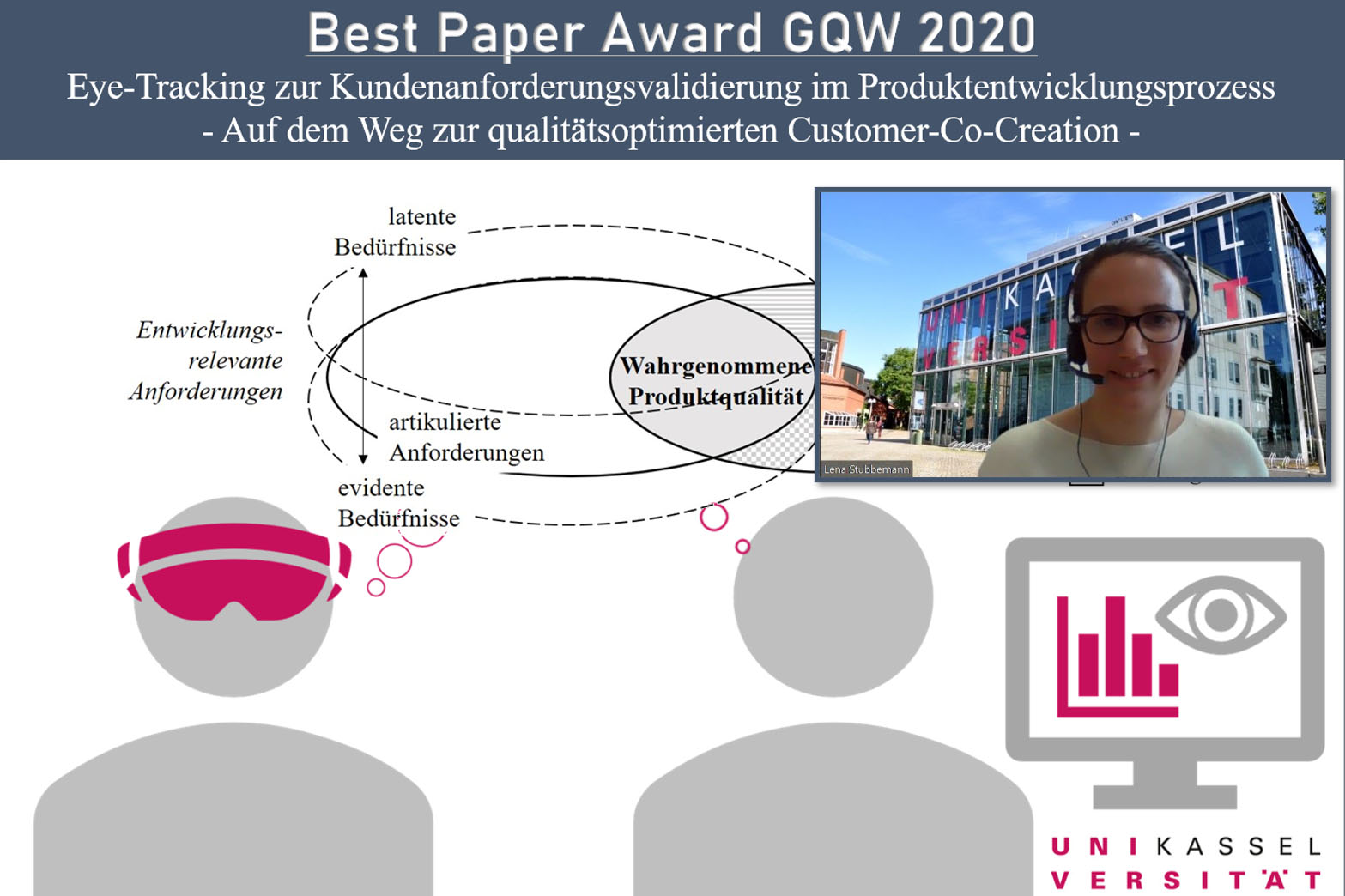 Entsprechend hochkarätig waren die elf Vorträge zum Thema Qualität auf dieser Tagung, die zuvor Universitäten und Hochschulen aus ganz Deutschland durch ein mehrstufiges Review-Verfahren ausgewählt hatten. Im Rahmen der Veranstaltung konnten die Professoren und Professorinnen, welche Mitglied der GQW sind, zudem gemeinsam bestimmen, welche Einreichung zum „Best Paper“ gewählt wird. Sie entschieden sich mehrheitlich für das Paper „Eye-Tracking zur Kundenanforderungsvalidierung im Produktentwicklungsprozess. Auf dem Weg zur qualitätsoptimierten Customer-Co-Creation“ von Lena Stubbemann und Prof. Dr.-Ing. Robert Refflinghaus von der Universität Kassel sowie Prof. Dr. Thies Pfeiffer von der Hochschule Emden. Alle auf der Tagung vorgestellten Beiträge werden im Nachgang in einem Tagungsband veröffentlicht.