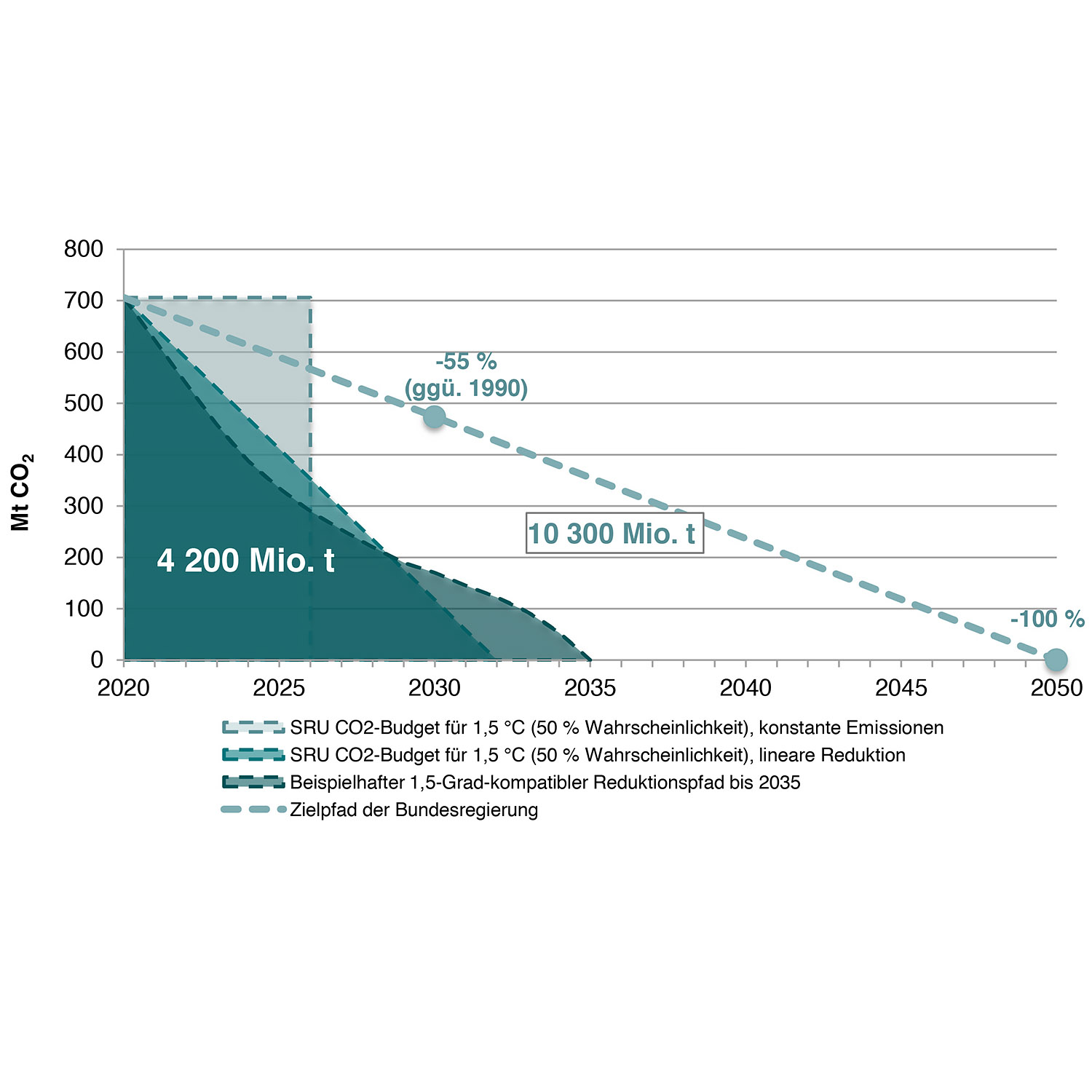 Um das 1,5-Grad-Budget einzuhalten, sind unter der Voraussetzung weltweit gleicher Pro-Kopf-Emissionen CO2-Minderungen von mindestens minus 60 Prozent bis 2025 und mindestens minus 85 Prozent bis 2030 (jeweils gegenüber 1990) erforderlich. Denn entscheidend dafür, die Risiken und Auswirkungen des Klimawandels erheblich verringern zu können, sind die kumlierten Emissionen. Eine gleichmäßige, lineare Minderung bis 2035 ist dafür allerdings nicht ausreichend (siehe Grafik).