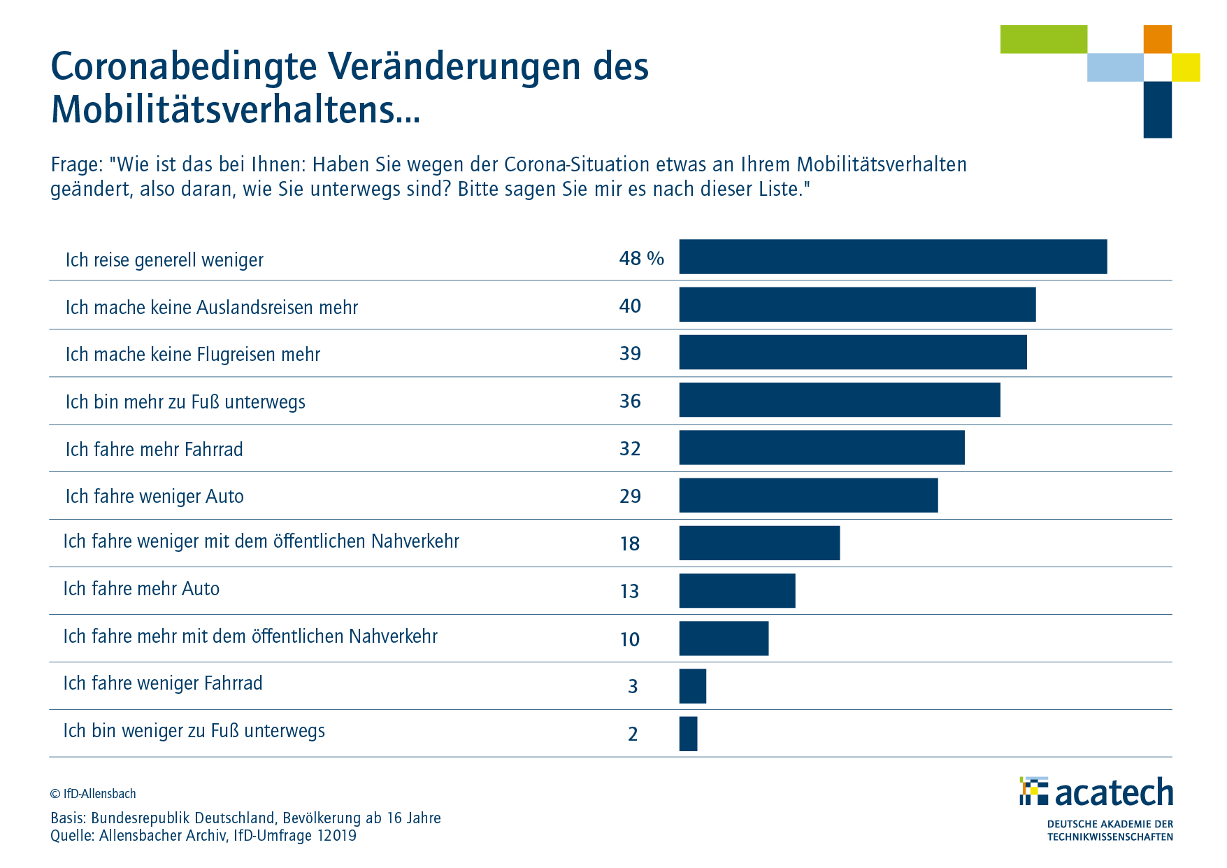 Wie wirkt sich die Corona-Krise auf das Mobilitätsverhalten der Deutschen aus? Wie ist es um die Akzeptanz der Elektromobilität in der Bevölkerung bestellt? Bleiben der Klima- und Umweltschutz wichtige Anliegen? Der Mobilitätsmonitor 2020, eine Untersuchung des Instituts für Demoskopie (IfD) Allensbach im Auftrag von acatech – Deutsche Akademie der Technikwissenschaften, liefert Antworten. Die repräsentative Bevölkerungsumfrage, die bereits zum zweiten Mal nach 2019 durchgeführt wurde, lässt erkennen, dass Bürgerinnen und Bürger von gravierenden Veränderungen im Mobilitätssystem ausgehen.
