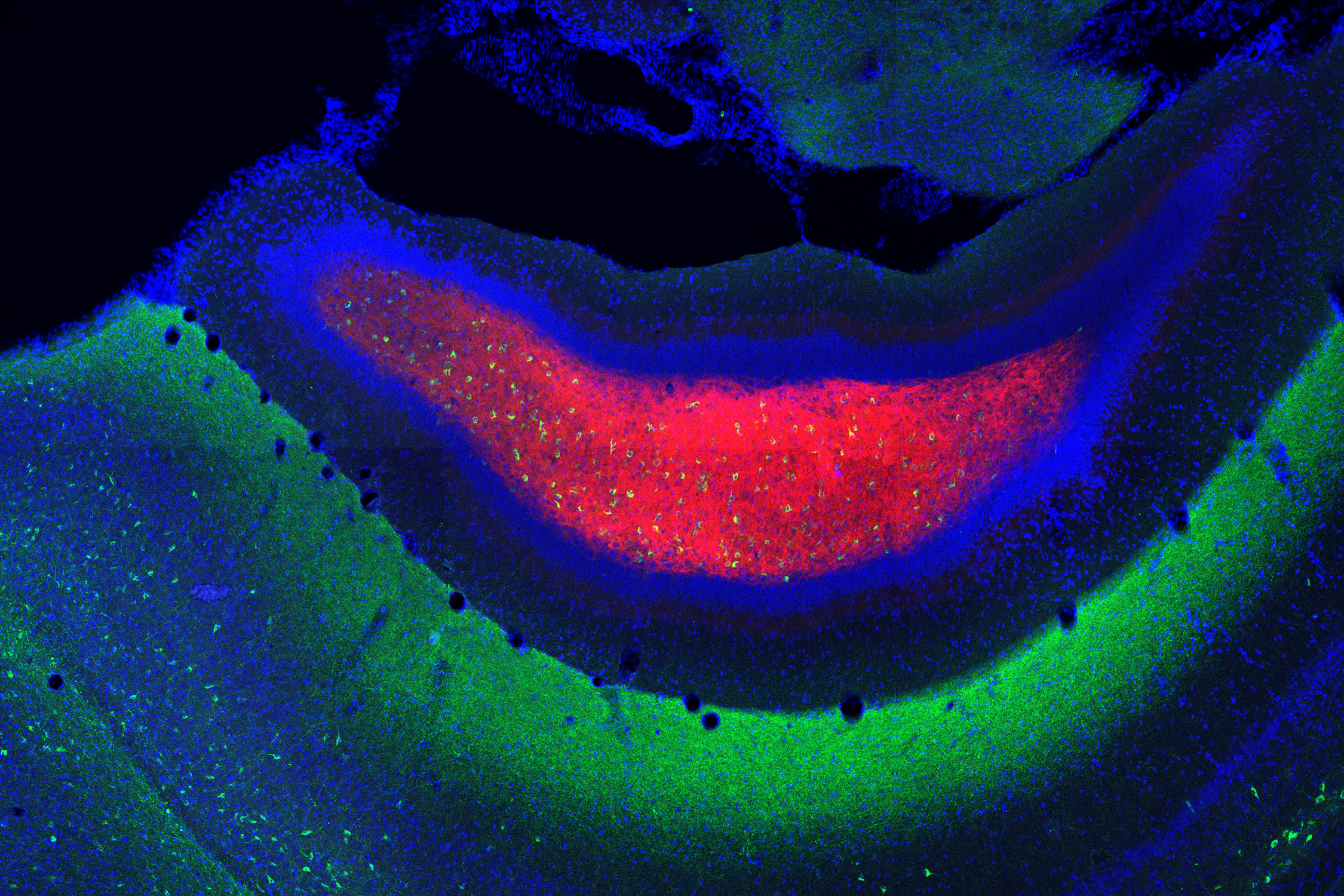Zweitens wandten sie die Technik der Kalzium-Bildgebung an, die eine Liveaufnahme der Neuronenaktivität ermöglicht. Diese gentechnisch veränderten Neuronen leuchten auf, wenn sie aktiviert werden. Wenn die Tiere mehrere Tage lang einer neuen Umgebung ausgesetzt wurden, war die Aktivität der Moos-Zellen, welche die Signale an die Granule-Zellen sendeten, zunächst hoch und wurde dann immer niedriger. Als die Mäuse dann in eine andere neue Umgebung gebracht wurden, stieg die Aktivität wieder an, was zeigt, dass diese Neuronen spezifisch für die Verarbeitung neuer Umwelteinflüsse relevant sind.