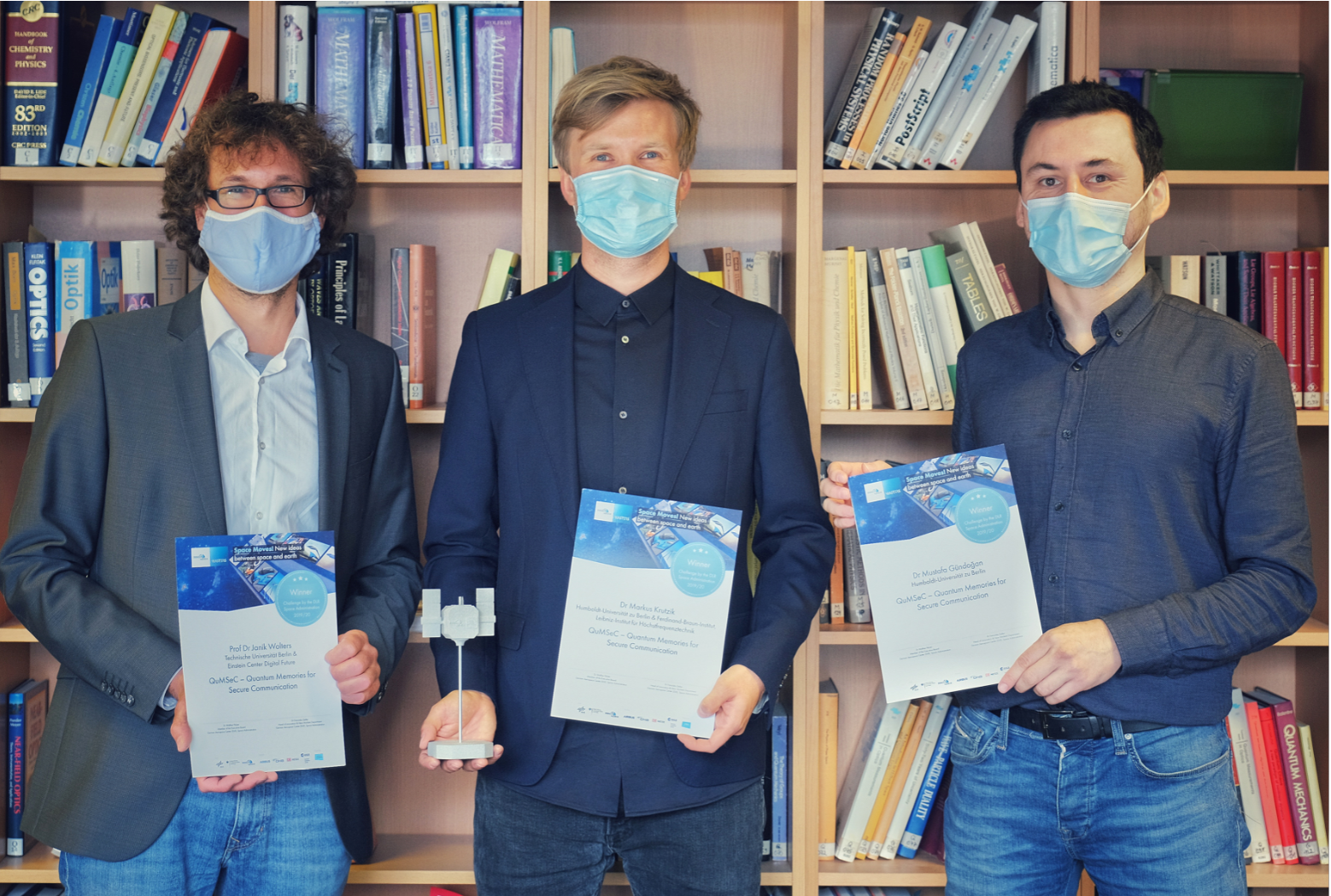 Das Berliner Projekt „wurde aus 117 eingereichten Ideen ausgewählt und beschäftigt sich mit der abhörsicheren Quantenkommunikation, die künftig auch bei nicht-vertrauenswürdigen Satelliten funktionieren soll. Zum Gewinnerteam gehört Dr. Markus Krutzik, der am Ferdinand-Braun-Institut, Leibniz-Institut für Höchstfrequenztechnik (FBH) das Joint Lab Integrated Quantum Sensors leitet, das FBH und Humboldt-Universität zu Berlin gemeinsam betreiben. Die Idee zum ausgezeichneten Projekt wurde zusammen mit Dr. Mustafa Gündogan aus dem Joint Lab sowie Prof. Janik Wolters der AG Physikalische Grundlagen der IT Sicherheit von der Technischen Universität Berlin und dem Einstein Center Digital Future entwickelt.
