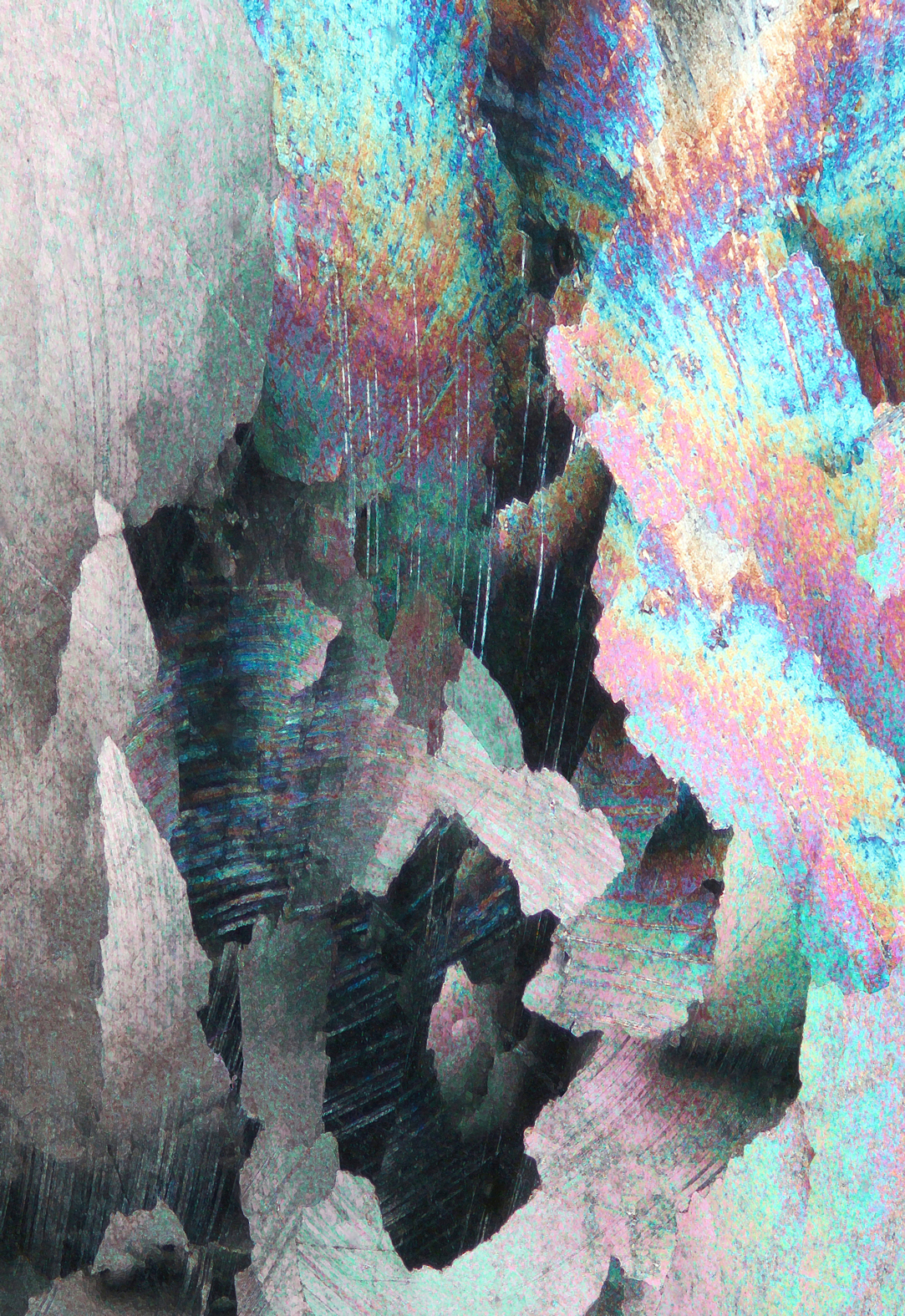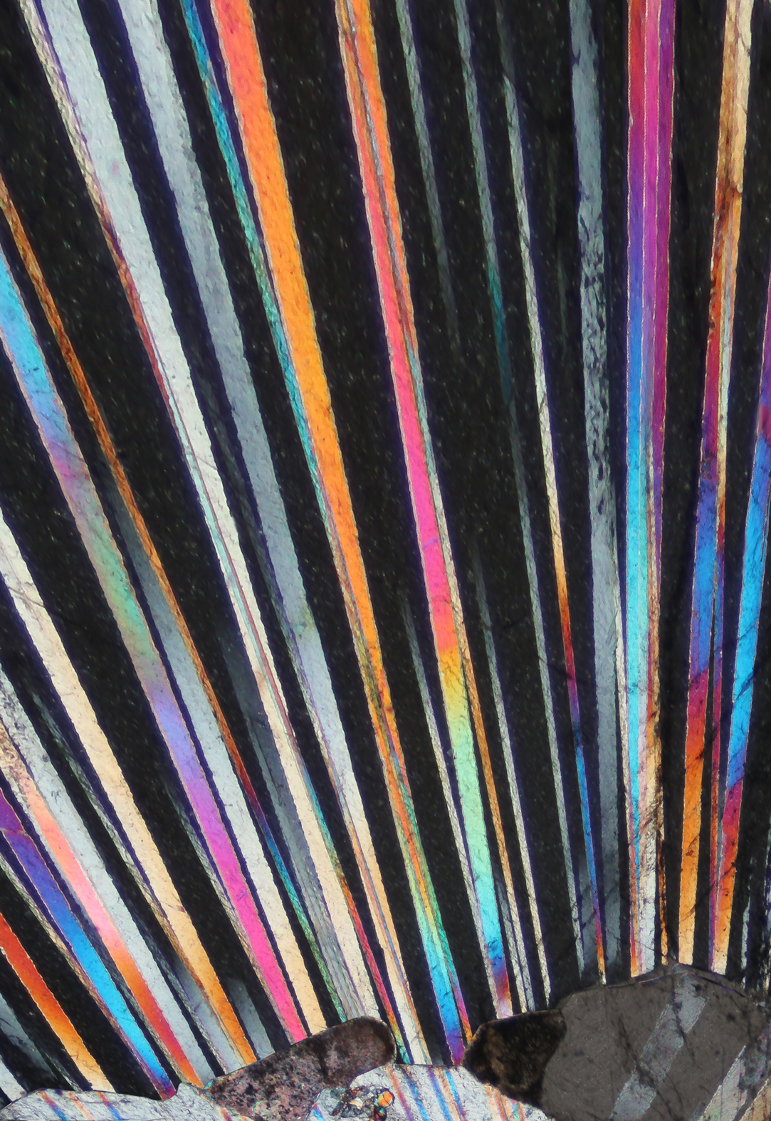 „Die Untersuchung im Durchlichtmikroskop erfolgt an hauchdünnen, feingeschliffenen oder polierten Probenscheibchen. Diese nennt man auch Dünnschliffe“ erläutert Michael Raith das Entstehen der Bilder. Viele Materialien werden dann lichtdurchlässig, so dass bei Betrachtung im Hellfeld feine Strukturen (Korngrenzen, Spaltbarkeiten, Risse) und Farberscheinungen sichtbar werden, die dem bloßen Auge verborgen bleiben. Bei Betrachtung des Dünnschliffs zwischen zwei senkrecht zueinander orientierten Polarisatoren treten infolge des häufig optisch anisotropen Verhaltens der Minerale vielfältigste Interferenzeffekte auf. Sie lassen das Korngefüge in unterschiedlichen Interferenzfarben erscheinen. Durch Einfügen von optischen Hilfsobjekten (Lambda-Platte, Lambda/4-Platte, Quarzkeil,) in den Strahlengang des Mikroskops entstehen weitere mineral-spezifische Interferenzfarbeffekte.