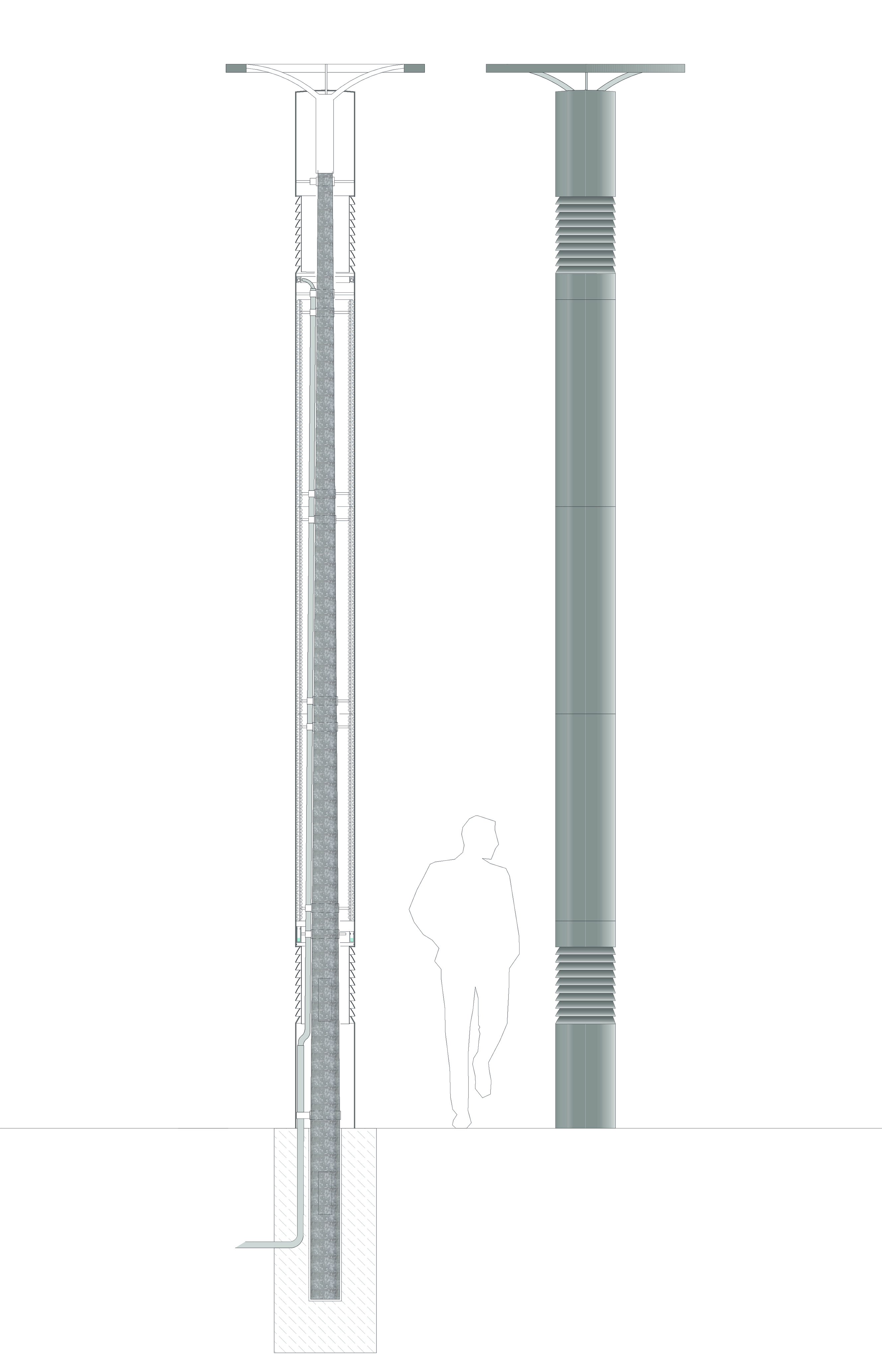 Wie eine Verdunstungsfunktion analog der von Bäumen technisch umsetzbar wäre, damit beschäftigt sich Bernhard Lenz mit seinen Studierenden und konnte Ideen für ein neues System entwickeln. „Weil der Baum als Organismus immer auch Photosynthese betreiben muss, braucht er eine große Krone, in der die Blätter der Sonne ausgesetzt sein müssen“, so der Wissenschaftler. Mit seinem Team konnte er eine Lösung entwickeln, die ohne Photosynthese auskommt und damit auch räumlich deutlich kompakter ist: eine technische Verdunstungseinrichtung, die sich beispielsweise auch an bestehende Straßenlaternen ankoppeln lässt. Dieses „cooling device“ besteht aus nach außen geschlossenen Ringelementen, deren Innenseiten eine spezifische dreidimensionale Struktur aufweisen, angelehnt an die Struktur des menschlichen Darms. „So schafft man mit geringen Abmaßen eine große Oberfläche für die Verdunstung von Wasser“, so Lenz. In diesen Verdunstern – so die Idee – wird Wasser über die innenliegenden Oberflächen geführt. Im Unterschied zu Düsen kann auch weniger reines Oberflächenabflusswasser genutzt werden. Fotovoltaisch betriebene Lüfter saugen Umgebungsluft oben an und führen diese so an den feuchten Oberflächen vorbei. Der Grad der Verdunstung lässt sich dabei über die Luftgeschwindigkeit, also die Lüfter, regeln. Dadurch gibt ein „cooling device “ kühle und feuchte Luft an die Umgebung ab, ähnlich wie sein biologisches Vorbild. „Das System würde sich erst einschalten, wenn eine Schwellentemperatur überschritten ist und sich ausschalten, sobald eine gewisse relative Luftfeuchtigkeit erreicht ist. Wir möchten ja kein Tropenklima erzeugen“, so Lenz.
