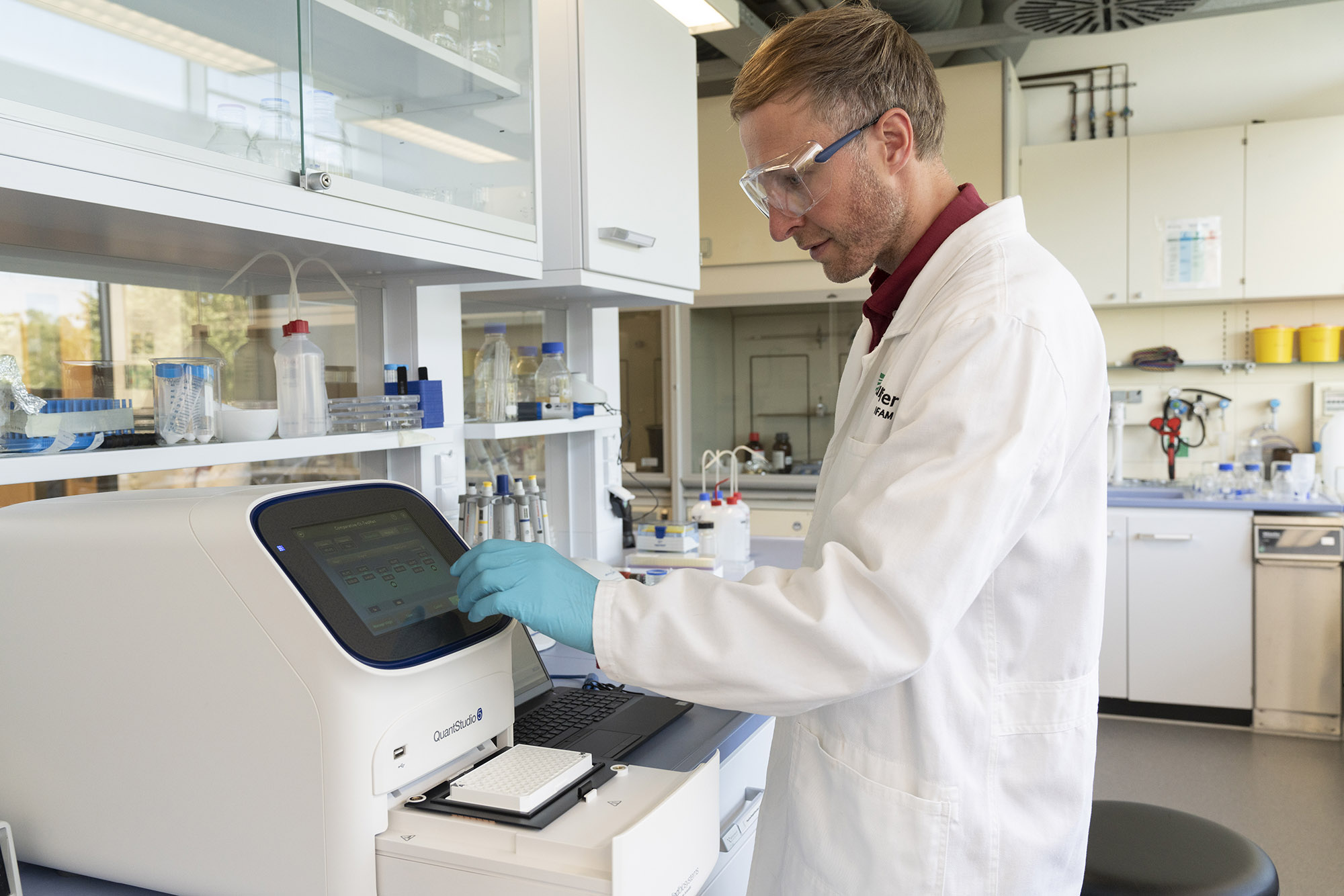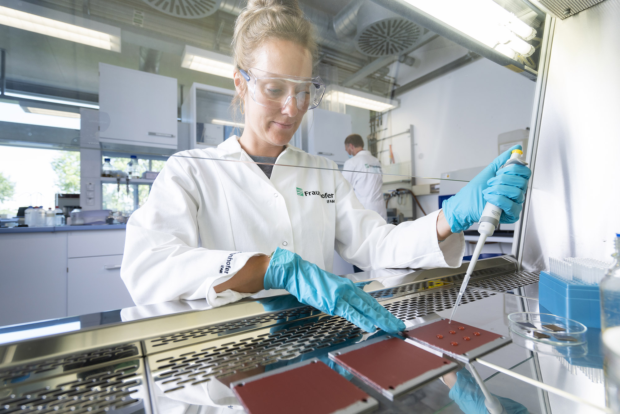 Neue Lösungswege erfordern eine sichere Methode zur Prüfung der Wirksamkeit. Zuverlässige, schnelle und präzise Testverfahren sind daher wesentlich für die Entwicklung von antimikrobiellen Oberflächen. Das Fraunhofer IFAM setzt hierbei eine quantitative Echtzeit-PCR oder engl. real-time PCR analysis (qPCR) ein. Die qPCR ist eine Vervielfältigungsmethode für Nukleinsäuren, die auf dem Prinzip der herkömmlichen Polymerase-Kettenreaktion (PCR) beruht und zusätzlich eine Quantifizierung der gewonnenen Nukleinsäuren ermöglicht. Die Quantifizierung der untersuchten Proben wird mittels Fluoreszenzmessungen durchgeführt, die während eines PCR-Zyklus in Echtzeit erfasst werden. Die Fluoreszenz nimmt proportional mit der Menge der PCR-Produkte zu. Dies erlaubt es, die Effizienz der getesteten Oberflächen absolut und relativ zu vergleichen.
