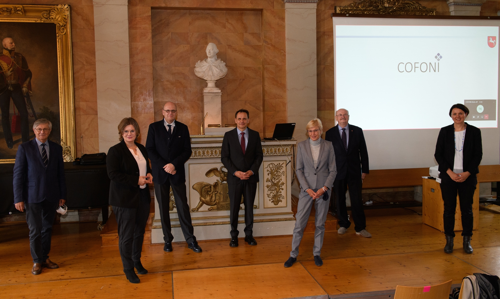 Das Verbundvorhaben startete am Donnerstag, dem 22. Oktober 2020, mit einer „Kick-Off“-Veranstaltung in der Aula am Wilhelmsplatz in die entscheidende Aufbauphase. Unter Einhaltung der Abstands- und Hygieneregeln referierten in Präsenz- sowie videounterstützten Vorträgen Expert*innen der einzelnen beteiligten Universitäten, Hochschulen und Wissenschaftseinrichtungen. Grußworte sprachen die Staatssekretärin des Niedersächsischen Ministeriums für Wissenschaft und Kultur, Dr. Sabine Johannsen, der Sprecher des Vorstandes der UMG, Prof. Dr. Wolfgang Brück, und die Vizepräsidentin der Georg-August-Universität, Dr. Valérie Schüller. Prof. Dr. Jürgen Wienands, Forschungsdekan der UMG, leitete die Veranstaltung als zentraler Koordinator von COFONI ein. Aus Berlin war Prof. Dr. Lothar Wieler, Präsident des Robert-Koch-Instituts (RKI), zugeschaltet. Er hielt die Key-Note-Lecture zum Thema „COVID-19. Das Robert-Koch Institut und eine Pandemie – wo stehen wir?“ Ebenfalls vor Ort in der Aula am Wilhelmsplatz waren Prof. Dr. Michael P. Manns, Präsident der Medizinischen Hochschule Hannover (MHH), und Dr. Dr. h.c. Gerhard Greif, Präsident der Stiftung Tierärztliche Hochschule Hannover (TiHo).