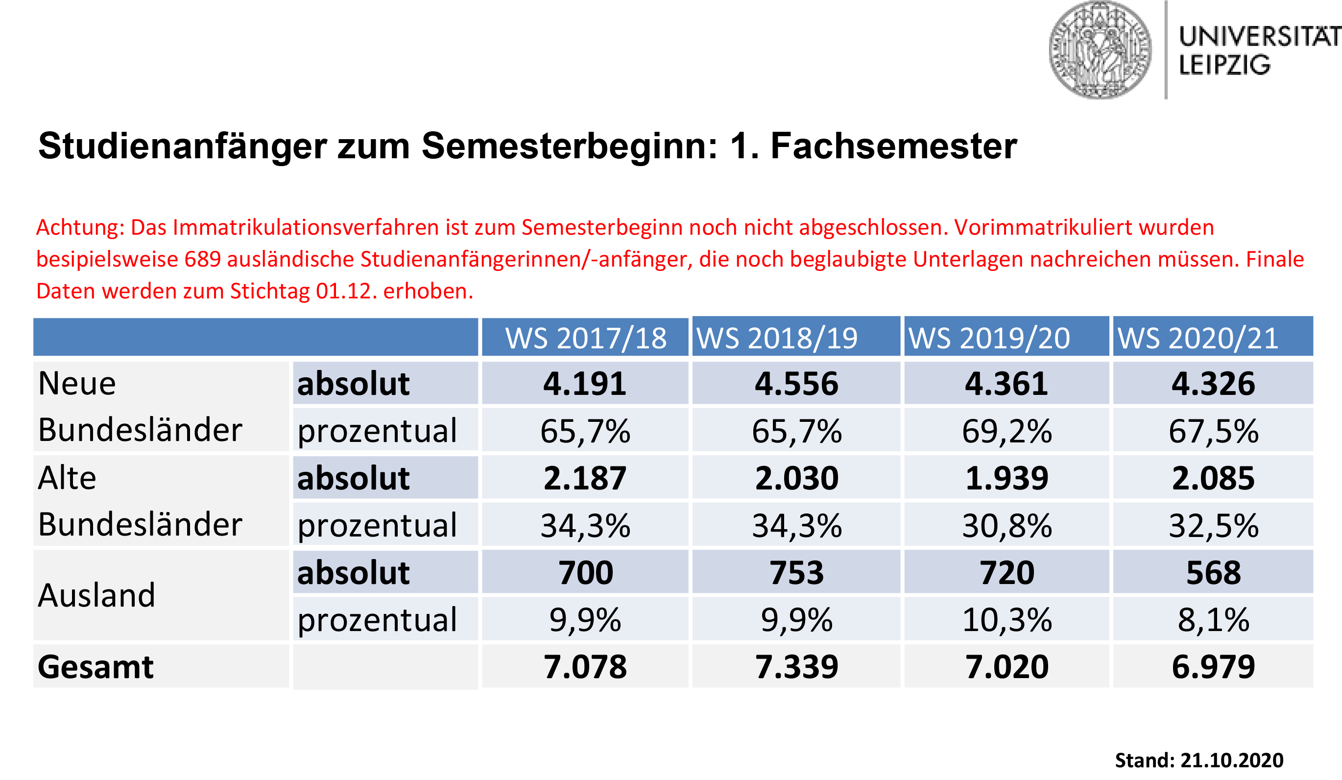 Die endgültigen Immatrikulationszahlen stehen erst am 1. Dezember 2020 fest. Wie in den Vorjahren werden noch Nachzügler in die Statistik eingehen, die ihren Studienplatz zwar angenommen, aber noch nicht alle nötigen Unterlagen eingereicht oder ihren Semesterbeitrag noch nicht bezahlt haben.