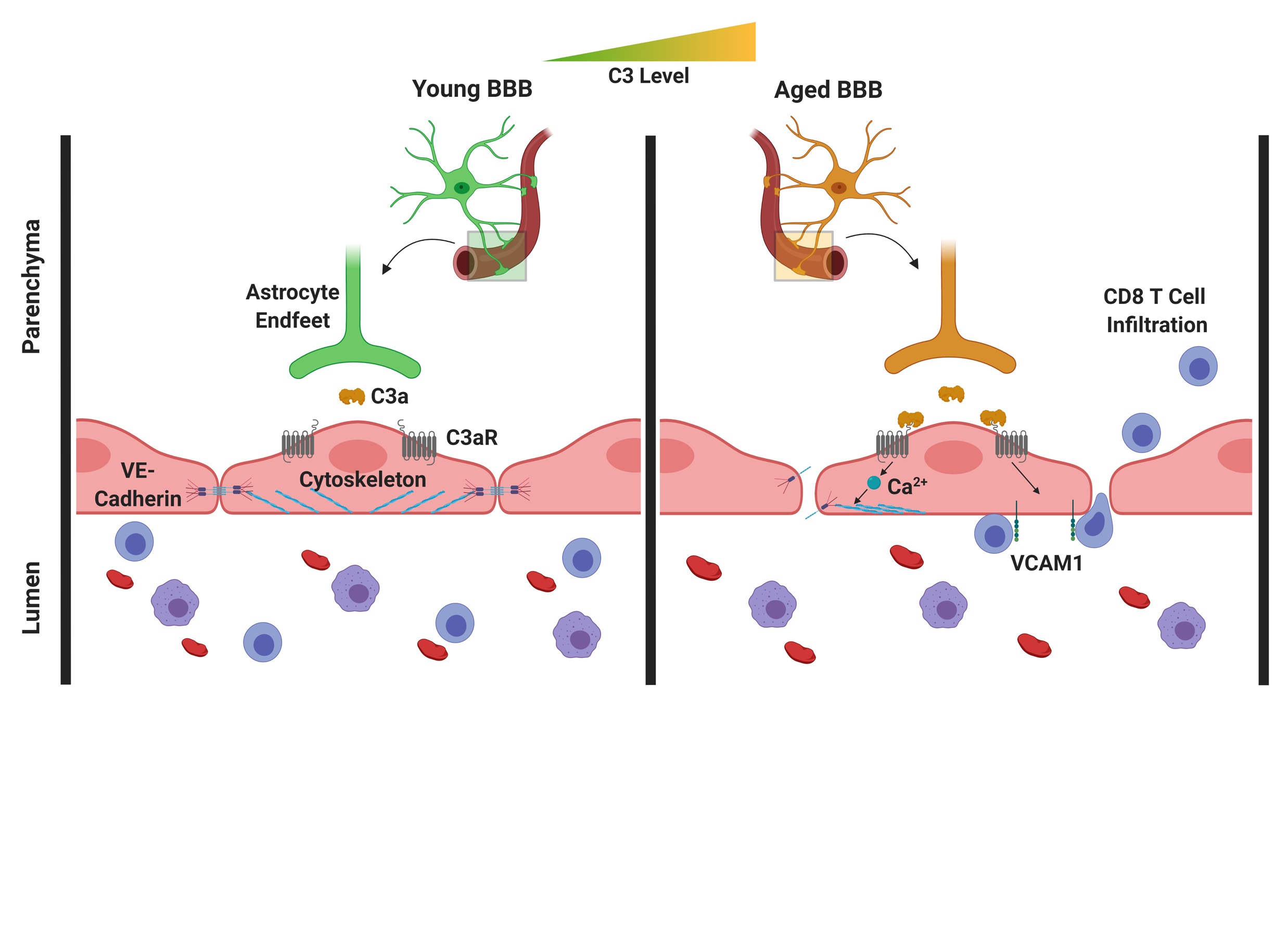 BU: Im alternden Gehirn nimmt die C3/C3a-Produktion zu und die C3a-Rezeptoren auf Gefäßendothelzellen des Gehirns werden aktiviert. Als Reaktion darauf produzieren diese Zellen vermehrt das Adhäsionsmolekül VCAM-1, was zu einer verstärkten Einwanderung von Lymphozyten in das Gehirn führt. Zusätzlich kommt es durch die Aktivierung des C3a-Rezeptors zu einer Mobilisierung von Calcium-Ionen in den Zellen, was zu einer Störung des Gefäßendothel-Cadherins führt, welches von zentraler Bedeutung für die Verbindung dieser Zellen ist. Ein Aufbrechen dieser Verbindungen hat eine erhöhte Durchlässigkeit der Blut-Hirn-Schranke zur Folge.