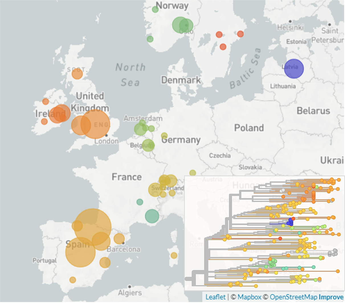 Die «Nextstrain»-Plattform wurde 2015 mit dem Ziel ins Leben gerufen, Krankheitserreger mittels genetischer Sequenzierung in Echtzeit zu verfolgen und möglichst auch die künftige Verbreitung von Viren vorherzusagen. Nextstrain stützt sich für die Analyse auf die Tatsache, dass Viren beim Vervielfältigen ihres Erbguts kleine Fehler machen. Anhand dieser Fehler errechnet die Plattform einen «Stammbaum», der anzeigt, in welchem Verwandtschaftsverhältnis einzelne Virusproben zueinanderstehen. Dies erlaubt Forschenden, die Ausbreitung von Viren rund um den Globus und im Laufe der Zeit zu verfolgen. Nextstrain kam bereits für viele Krankheitserreger zum Einsatz, unter anderem für jene, die Zika, Ebola, Tuberkulose und natürlich Covid-19 auslösen. Die Forschungsgruppe um Prof. Dr. Richard Neher an der Universität Basel leitet derzeit die Analysen der SARS-CoV-2-Sequenzen für die meisten europäischen Länder sowie eine gesonderte Analyse für die Schweiz.