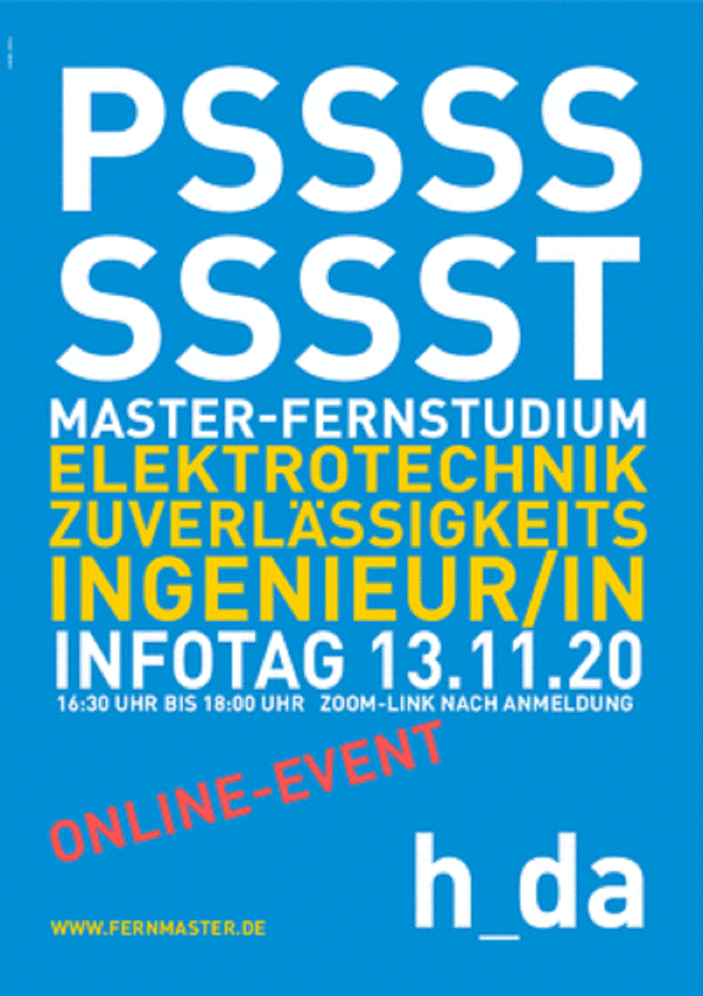 Darmstadt/Koblenz – Am Freitag, den 13. November 2020, um 16:30 bietet die Hochschule Darmstadt für alle Fernstudieninteressierten eine virtuelle Informationsveranstaltung an: Das Team stellt die berufsbegleitenden Fernstudienangebote Elektrotechnik (M.Sc.), Zuverlässigkeitsingenieurwesen (M.Eng.) und das Programm vom Techniker zum Master ausführlich vor. Via Zoom-Meeting erfahren die Teilnehmenden alles über die Studieninhalte, den Ablauf und die Organisation des Fernstudiums und haben dabei Gelegenheit live Fragen zu stellen – entweder mündlich oder schriftlich per Chatfunktion. Wer teilnehmen möchte, wird zwecks erleichterter Planung gebeten sich telefonisch (06151) 16-30128 oder per Mail an info@fernmaster.de anzumelden – und erhält anschließend den Zugangslink.
