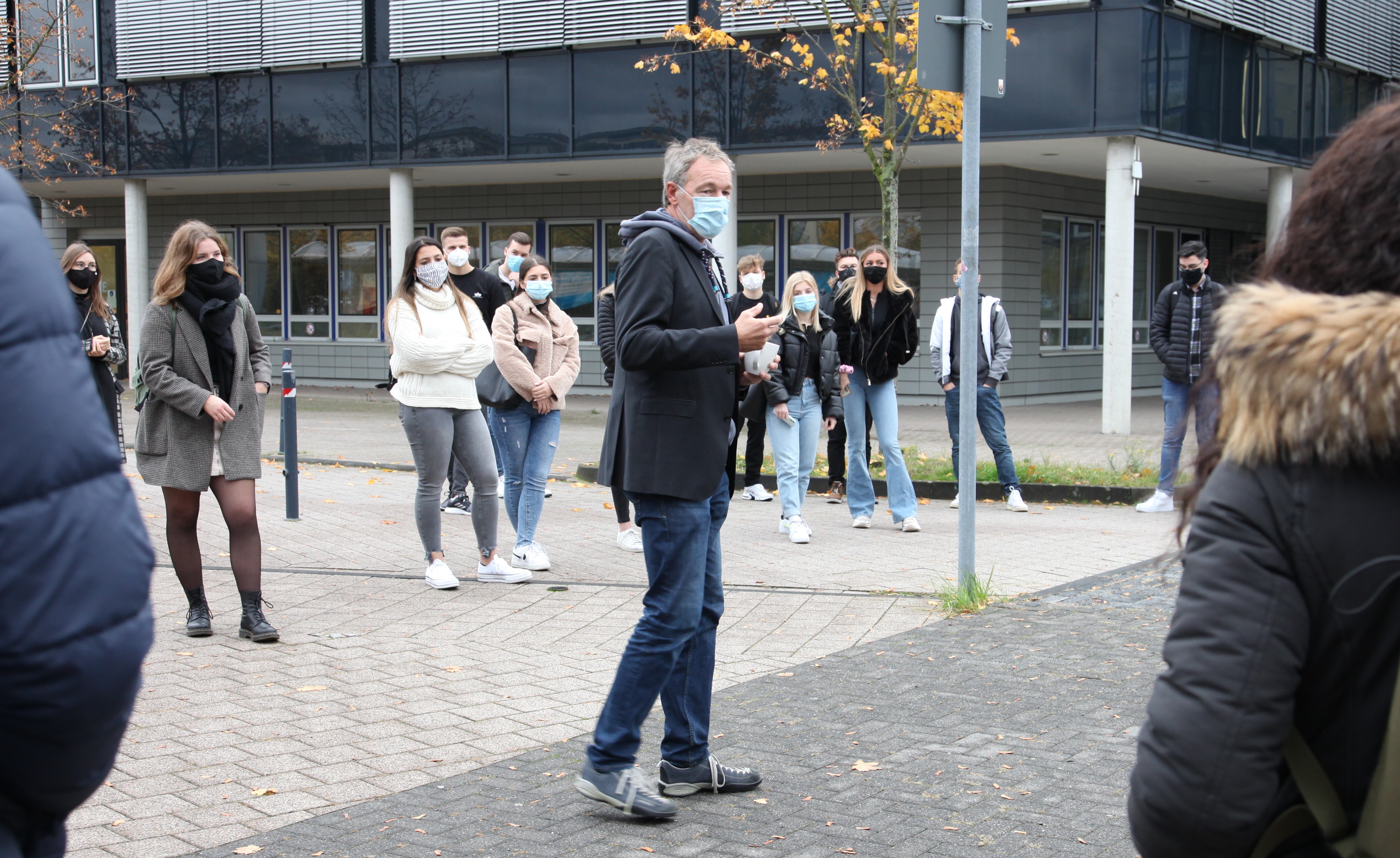 Bildzeile: Erstsemesterbegrüßung im Oktober 2020 unter Coronabedingungen: Professor Norbert Seeger und Studierende tragen zum Schutz eine Mund-/Nasenmaske. Foto: Eva Tritschler