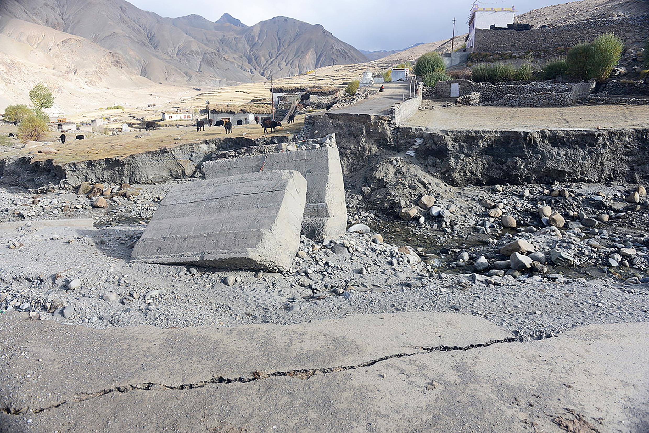 “In the wake of global glacier shrinkage caused by climate change, the danger from glacial lake outburst floods is seen as an increasingly pressing problem,” explains Prof. Nüsser of the South Asia Institute. An event like this unleashes huge amounts of water. Flash floods, for example, can wreak havoc on villages, agricultural areas, and infrastructure. To find out more about such events, the Heidelberg researchers studied a glacial lake outburst flood in Ladakh that destroyed houses, fields, and bridges in the village of Gya in August of 2014. Studies of the glacial lake, which is situated at 5,300 m above sea level, revealed a drastic short-tem lake level rise prior to the GLOF.