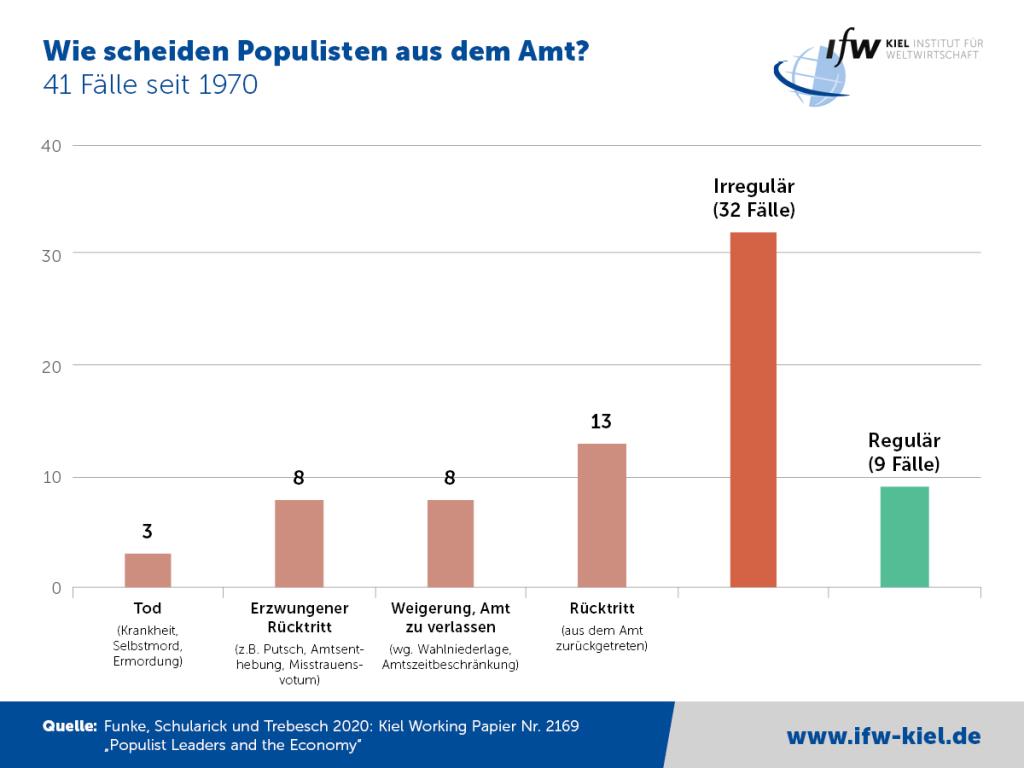 Populisten werden in der Studie (Funke, Schularick und Trebesch 2020: „Populist Leaders and the Economy"/https://www.ifw-kiel.de/de/publikationen/kieler-arbeitspapiere/populist-leaders-and-the-economy-15277/) als Politiker klassifiziert, die den Konflikt zwischen „dem Volk“ und „den Eliten“ heraufbeschwören und sich dann als einzige Vertreter des Volkes präsentieren. Die Autoren identifizieren nach dieser Definition 41 populistische Regierungen seit 1970. Von diesen schieden lediglich 9 Machthaber auf reguläre Weise aus ihrem Amt. Bei der überwiegenden Mehrheit (32 Fälle) kam es hingegen zu irregulären Abgängen, das heißt sie weigerten sich aus dem Amt zu gehen (8 Fälle), sie starben im Amt (3 Fälle), sie traten zurück (13 Fälle) oder wurden zu ihrem Rücktritt gezwungen, weil es zu einem Putsch, Amtsenthebungsverfahren oder Misstrauensvotum kam (8 Fälle).