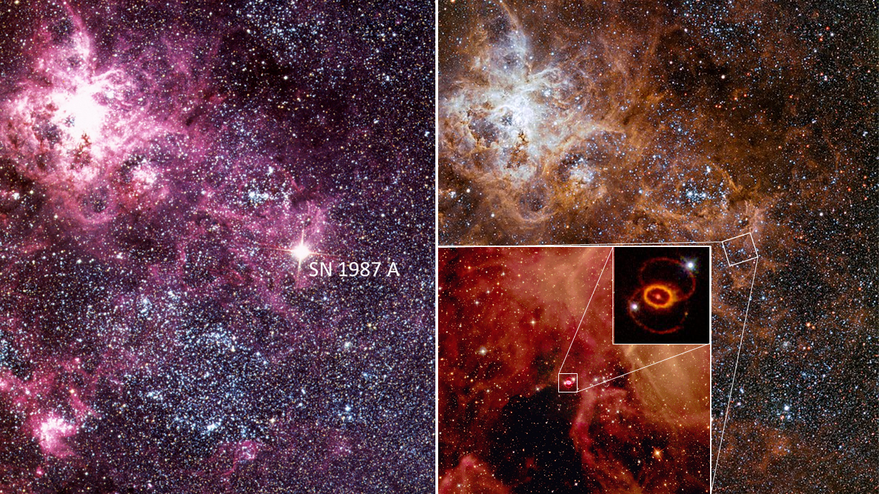 Kleine Neutrinodetektoren auf der Basis kohärenter Streuung würden auch eine neue Ära der Neutrinoastronomie eröffnen. Eine hochinteressante Neutrinoquelle sind Supernovae, jene gigantischen Explosionen am Ende der Entwicklung sehr massereicher Sterne. Einer sog. Kernkollaps-Supernova geht die Bildung eines Eisenkerns im Zentrum voraus, in welchem weitere Fusionsprozesse keine Energie mehr freisetzen. Der Kern bricht schließlich unter seiner eigenen Masse zusammen und wandelt sich in einen Neutronenstern oder gar in ein Schwarzes Loch um. Die freigesetzte Gravitationsenergie wird zu 99% in Form von Neutrinos abgestrahlt! Dies geschieht bereits einige Stunden, bevor die Supernova optisch sichtbar wird. 1987 leuchtete in der unserer Galaxis benachbarten Großen Magellanschen Wolke eine Supernova auf – das bisher jüngste Ereignis in unserer näheren kosmischen Umgebung (siehe Anhang). Durch Analyse der damals betriebenen Neutrinoexperimente konnten auch die vorher schon freigesetzten Supernova-Neutrinos nachgewiesen werden. Hierfür erhielt Masatoshi Koshiba 2002 den Nobelpreis für Physik.